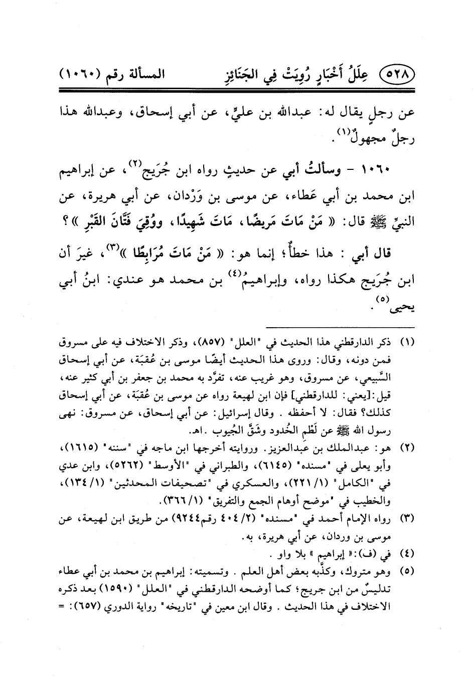 ١٠٦٠ - وسألتُ أَبِي عَنْ حديثٍ رَوَاهُ ابْنُ جُرَيج (٢) ، عَنْ إِبْرَاهِيمَ بْنِ مُحَمَّدِ بْنِ أَبِي عَطاء، عَنْ مُوسَى بْنِ وَرْدان، عَنْ أَبِي هُرَيْرَةَ، عَنِ النبيِّ (ص) قَالَ: مَنْ مَاتَ مَريضًا، مَاتَ شَهِيدًا، ووُقِيَ فَتَّانَ القَبْرِ؟
