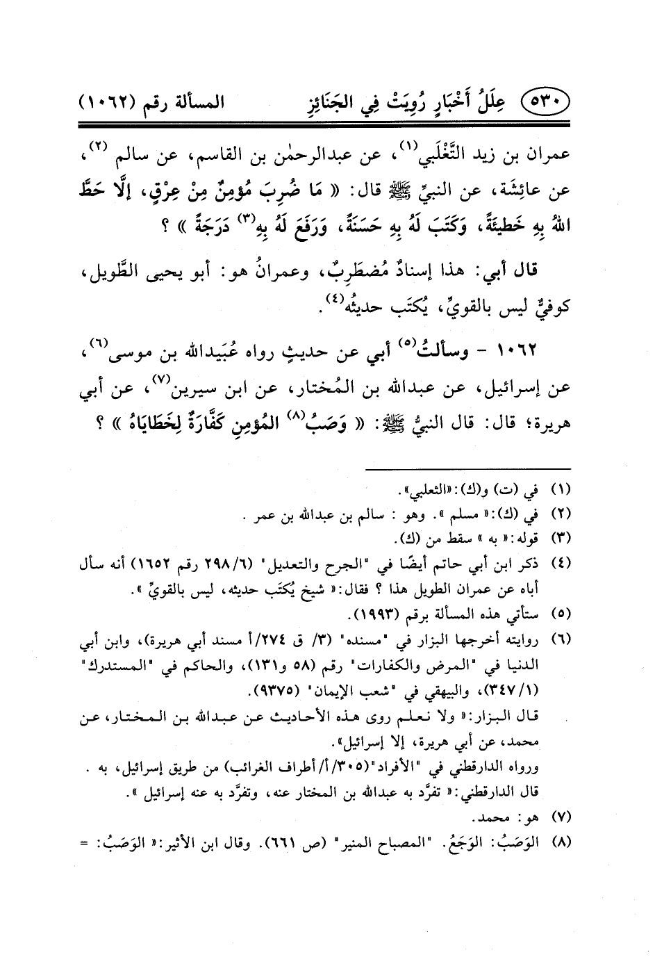 ١٠٦٢ - وسألتُ (٥) أَبِي عَنْ حديثٍ رواه عُبَيدالله بْنُ مُوسَى (٦) ، عَنْ إِسْرَائِيلَ، عَنْ عبد الله بْنِ المُختار، عَنِ ابْنِ سِيرِينَ (٧) ، عَنْ أَبِي هُرَيْرَةَ؛ قَالَ: قَالَ النبيُّ (ص) : وَصَبُ (٨) المُؤمِنِ كَفَّارَةٌ لِخَطَايَاهُ؟