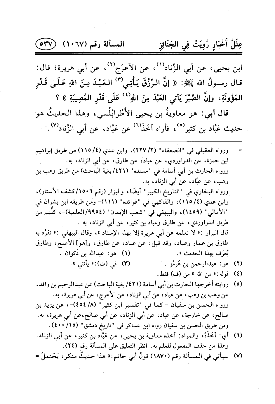 (٧) سيأتي في المسألة رقم (١٨٧٠) قولُ أبي حاتم: «هَذَا حديثٌ مُنْكَرٌ، يَحْتملُ أَنْ يكون بين مُعَاوِيَة وَأَبِي الزِّنَاد: عبَّاد بْن كَثِير، وهو عندي الأطرابلسي» . وانظر المسألة رقم (١٨٩٢) ففيها تفصيلٌ.