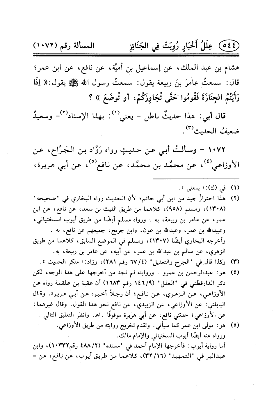 ١٠٧٢ - وسألتُ أَبِي عَنْ حديثٍ رَوَاهُ رَوَّاد ابن الجَرَّاح، عَنِ الأَوْزَاعِيِّ (٤) ، عَنْ محمَّد بْنِ محمَّد، عَنْ نَافِعٍ (٥) ،