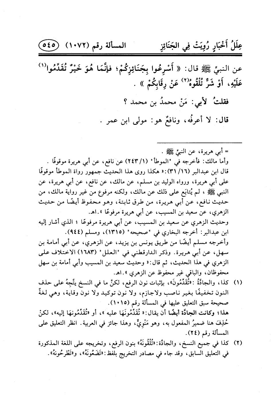 عن النبيِّ (ص) قَالَ: أَسْرِعُوا بِجَنَائِزِكُمْ؛ فإنَّمَا هُوَ خَيْرٌ تُقَدِّمُوا (١) عَلَيْهِ، أَوْ شَرٌّ تُلْقُوهُ (٢) عَنْ رِقَابِكُمْ.