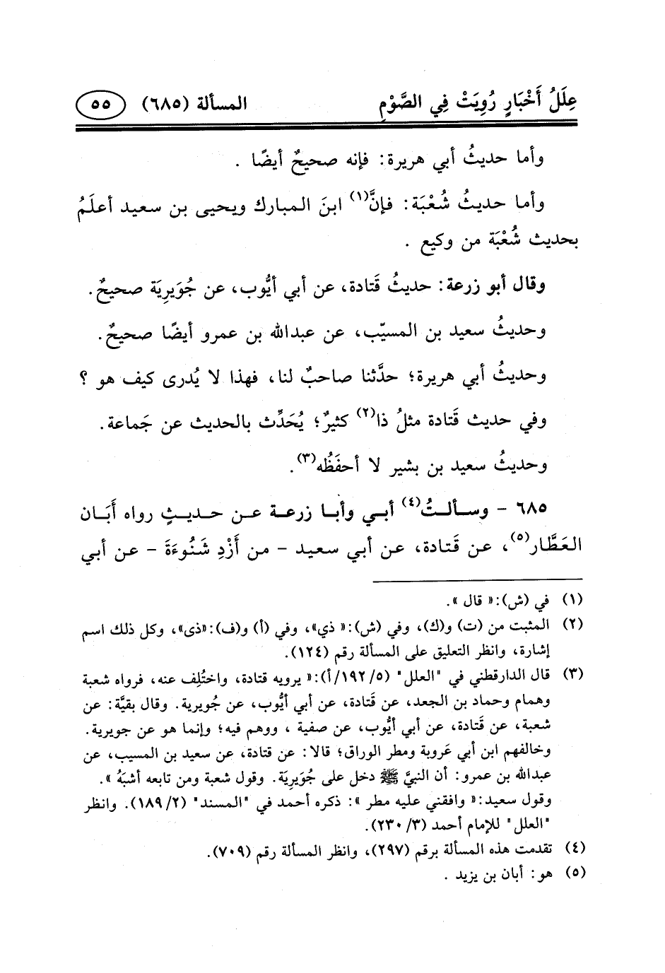 (٣) قال الدارقطني في "العلل" (٥/١٩٢/أ) : «يرويه قتادة، واختُلِف عنه، فرواه شعبة وهمام وحماد بْنِ الْجَعْدِ، عَنْ قَتادة، عَنِ أبي أيُّوب، عن جُويرية. وقال بقيَّة: عَنْ شُعْبَةَ، عَنْ قَتادة، عَنْ أبي أيُّوب، عن صفية، ووهم فيه؛ وإنما هو عن جويرية. وخالفهم ابن أبي عَروبة ومطر الوراق؛ قالا: عَنْ قَتَادَةَ، عَنْ سَعِيدِ بْنِ المسيب، عن عبد الله بن عمرو: أن النبيَّ (ص) دخل على جُوَيرِيَة. وقول شعبة ومن تابعه أشبَهُ» .