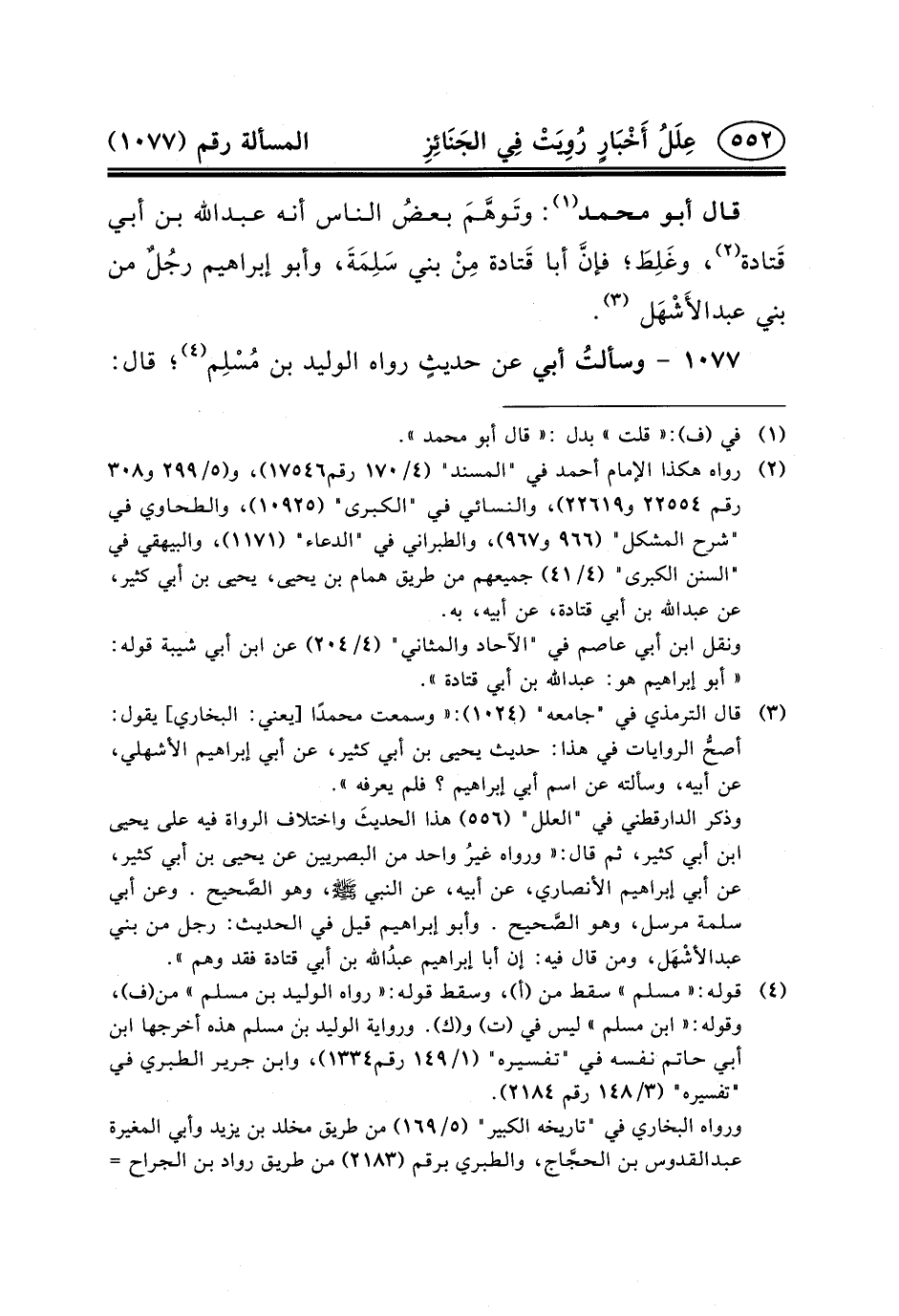 ١٠٧٧- وسألتُ أَبِي عَنْ حديثٍ رَوَاهُ الوليد ابن مُسْلِم (٤) ؛
