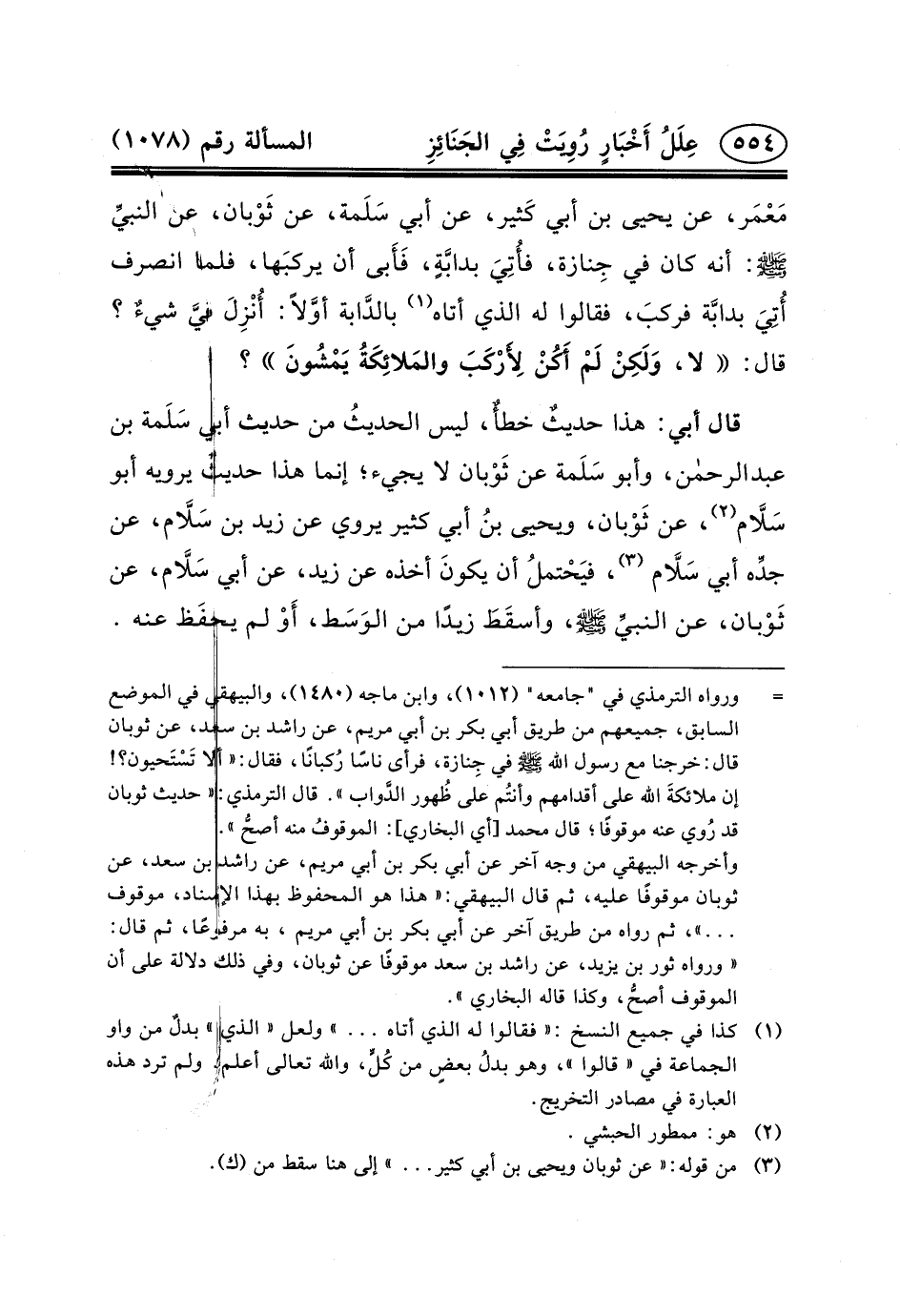 قَالَ أَبِي: هَذَا حديثٌ خطأٌ، لَيْسَ الحديثُ مِنْ حَدِيثِ أبي سَلَمة بن عبد الرحمن، وَأَبُو سَلَمة عَنْ ثَوْبان لا يَجِيءُ؛ إِنَّمَا هَذَا حديثٌ يَرْوِيهِ أَبُو سَلَاّم (٢) ، عَنْ ثَوْبان، وَيَحْيَى بنُ أَبِي كَثِيرٍ يَرْوِي عَنْ زَيْدِ بْنِ سَلَاّم، عَنْ جدِّه أَبِي سَلَاّم (٣) ، فيَحْتملُ أَنْ يكونَ أَخَذَهُ عَنْ زَيْدٍ، عَنْ أَبِي سَلَاّم، عَنْ ثَوْبان، عَنِ النبيِّ (ص) ، وأسقَطَ زَيْدًا مِنَ الوَسَط، أَوْ لم يحفَظ عنه.