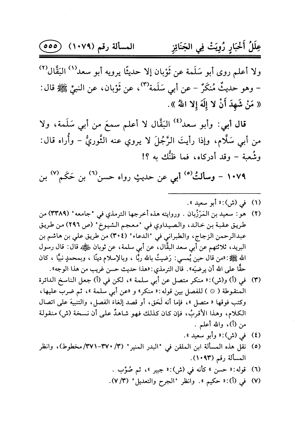 وَلا أَعْلَمُ رَوَى أَبُو سَلَمة عَنْ ثَوْبان إِلا حَدِيثًا يَرْوِيهِ أَبُو سَعْدٍ (١) البَقَّال (٢) - وَهُوَ حديثٌ مُنكَرٌ - عَنْ أَبِي سَلَمة (٣) ، عَنْ ثَوْبان، عن النبيِّ (ص) قَالَ: مَنْ شَهِدَ أَنْ لا إِلَهَ إِلا اللهُ.