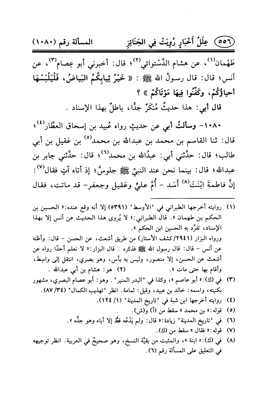 ١٠٨٠- وسألتُ أَبِي عَنْ حديثٍ رواه عُبيد ابن إسحاق العطَّار (٤) ؛ قال: ثنا القاسم بن محمد بن عبد الله بْنِ مُحَمَّدِ (٥) بْنِ عَقيل بْنِ أَبِي طَالِبٍ؛ قَالَ: حدَّثني أَبِي: عبدُالله بْنُ مُحَمَّدٍ (٦) ؛ قَالَ: حدَّثني جَابِرُ بن عبد الله؛ قَالَ: بَيْنَمَا نَحْنُ عِنْدَ النبيِّ (ص) جلوسٌ؛ إذ أَتَاهُ آتٍ فَقَالَ (٧) : إنَّ فاطمةَ ابْنَتَ (٨) أَسَد - أُمَّ عليٍّ وعَقيل وَجَعْفَرٍ- قد ماتت، فقال