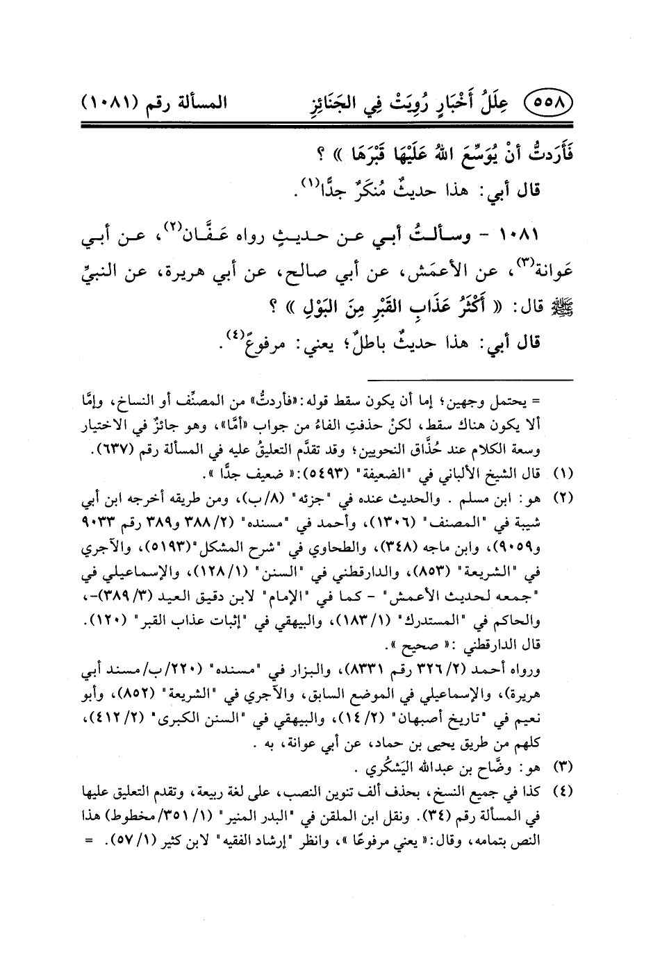 ١٠٨١ - وسألتُ أَبِي عَنْ حديثٍ رَوَاهُ عَفَّان (٢) ، عَنْ أَبِي عَوانة (٣) ، عَنِ الأعمَش، عَنْ أَبِي صَالِحٍ، عَنْ أَبِي هُرَيْرَةَ، عَنِ النبيِّ (ص) قَالَ: أَكْثَرُ عَذَابِ القَبْرِ مِنَ البَوْلِ؟