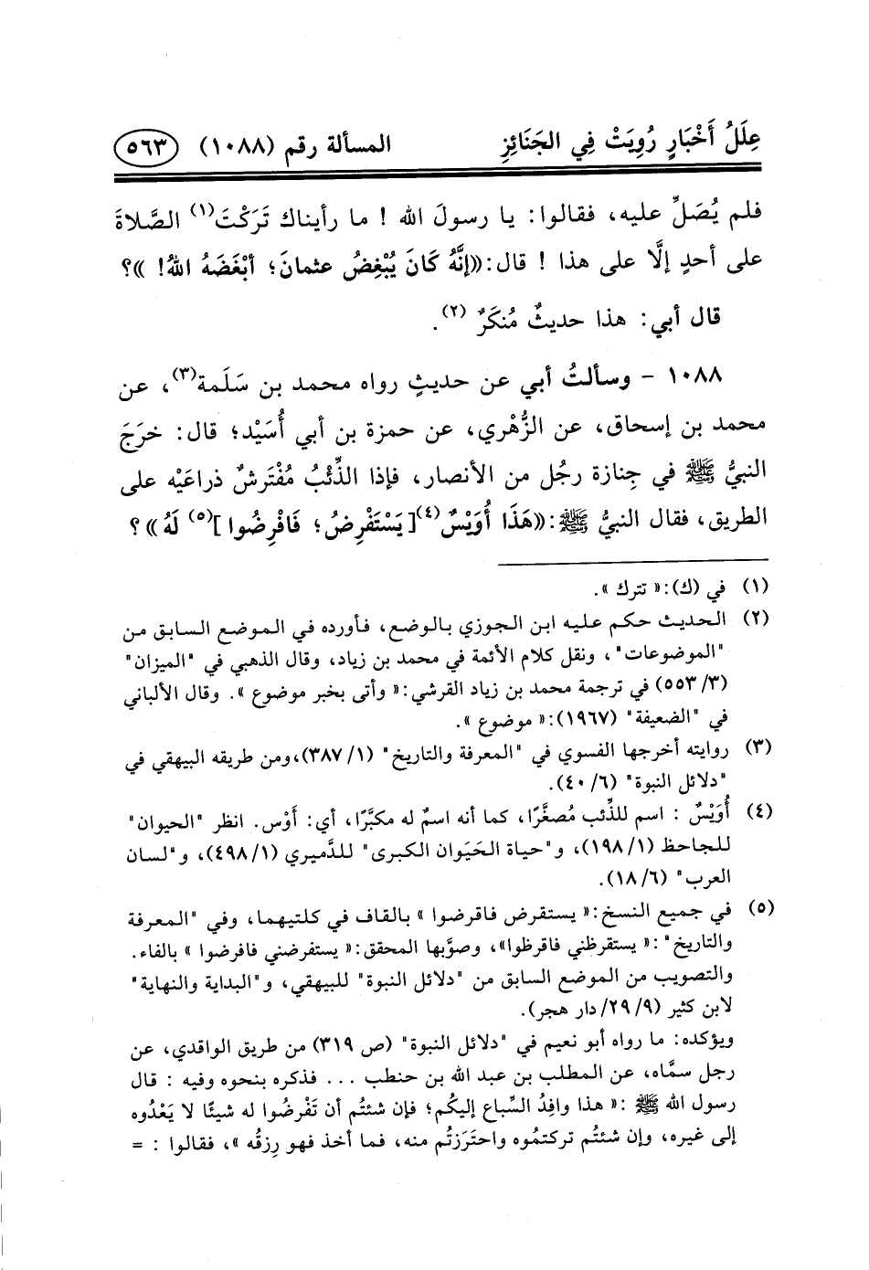 ١٠٨٨ - وسألتُ أَبِي عَنْ حديثٍ رَوَاهُ مُحَمَّدُ بْنُ سَلَمة (٣) ، عَنْ مُحَمَّدِ بْنِ إِسْحَاقَ، عَنِ الزُّهْري، عَنْ حَمْزَةَ بْنِ أَبِي أُسَيْد؛ قَالَ: خرَجَ النبيُّ (ص) فِي جِنازة رجُل مِنَ الأَنْصَارِ، فَإِذَا الذِّئْبُ مُفْتَرشٌ ذراعَيْه عَلَى الطريق، فقال النبيُّ (ص) : هَذَا أُوَيْسٌ (٤) [يَسْتَفْرِضُ؛ فَافْرِضُوا] (٥) لَهُ؟