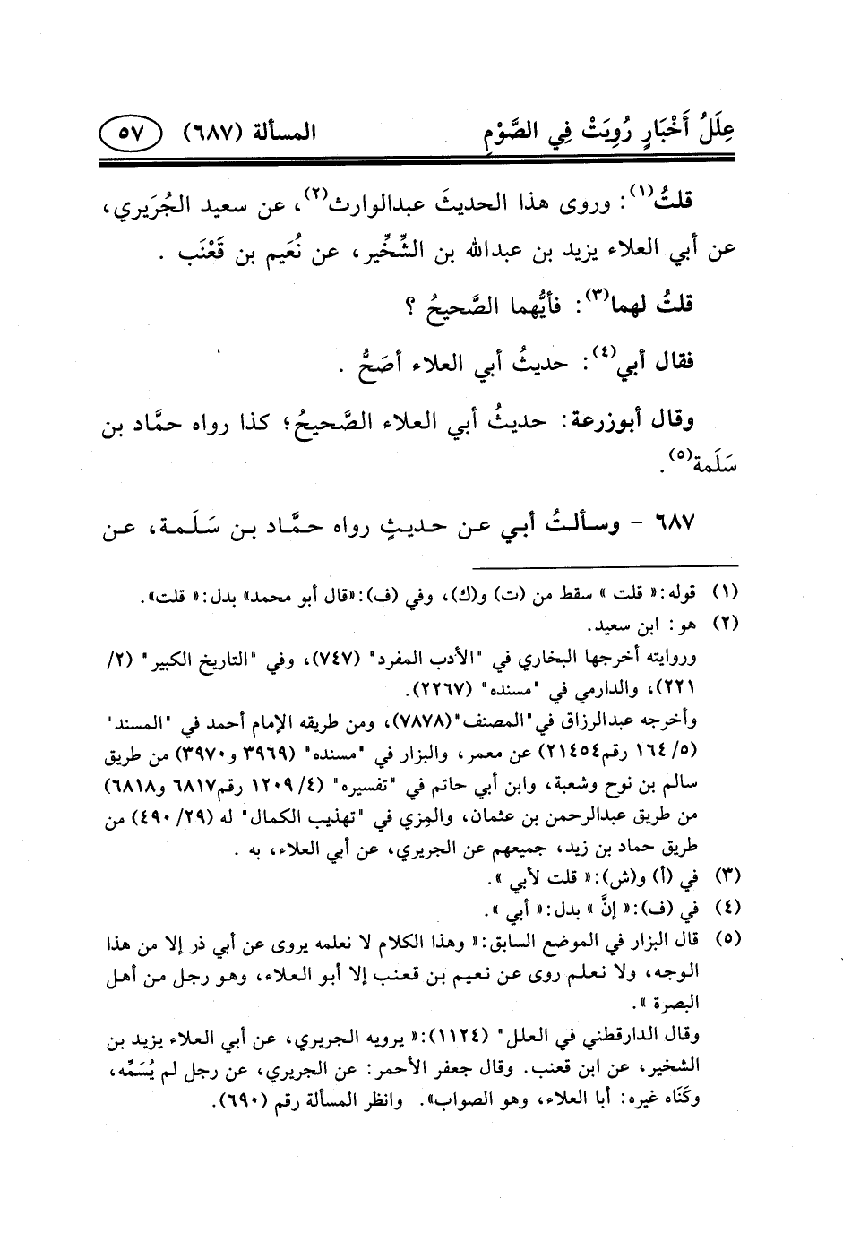 وقال أبوزرعة: حديثُ أَبِي الْعَلاءِ الصَّحيحُ؛ كَذَا رَوَاهُ حمَّاد بْنُ سَلَمة (٥) .