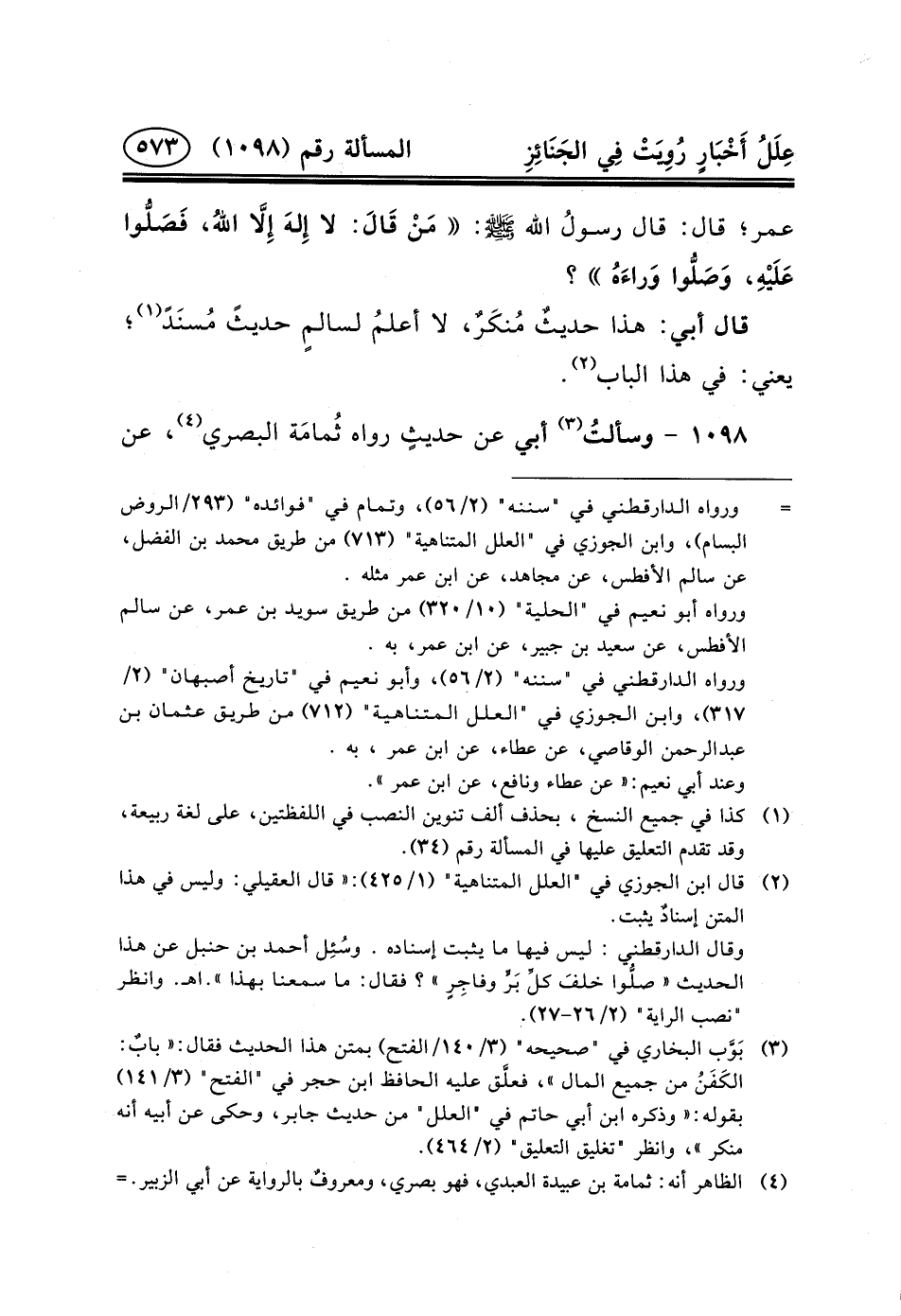 ١٠٩٨ - وسألتُ (٣) أَبِي عَنْ حديثٍ رَوَاهُ ثُمامَة البصري (٤) ، عن