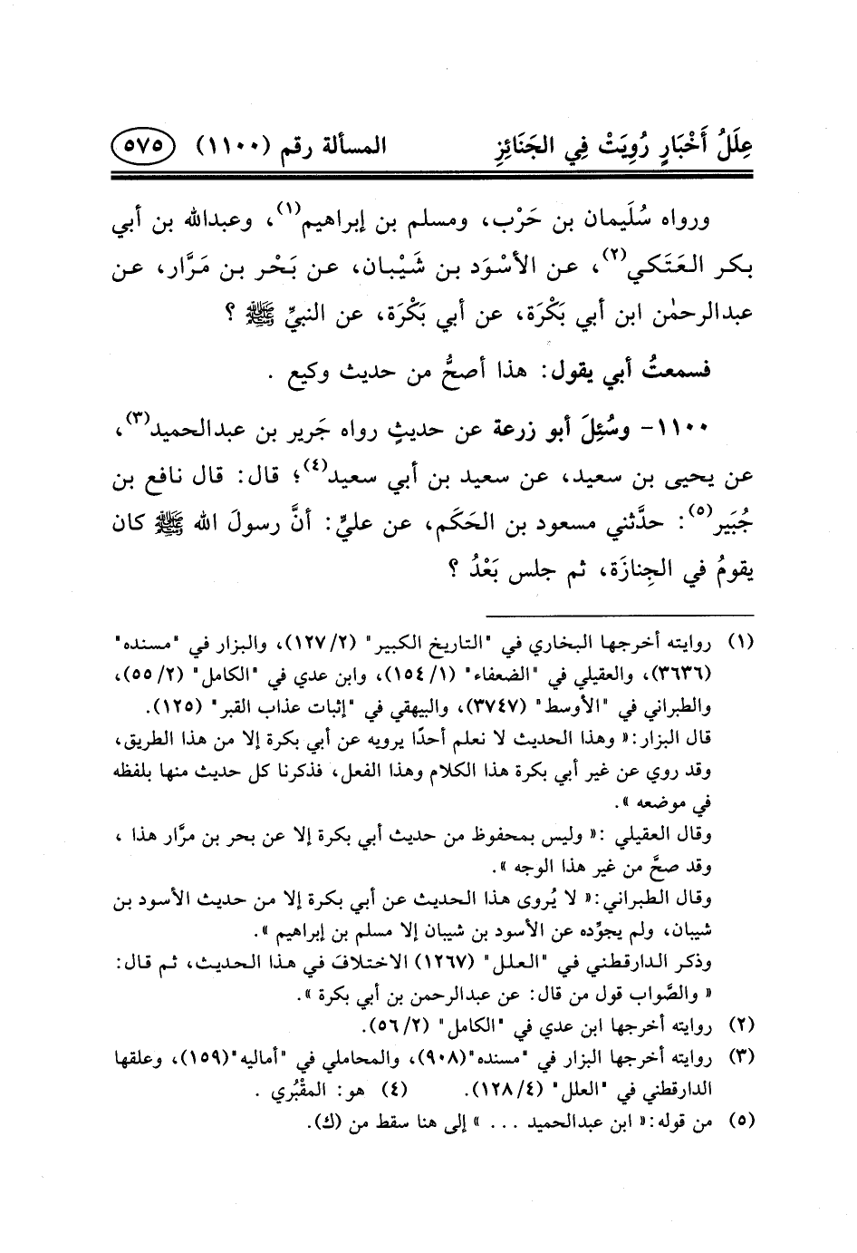 ١١٠٠- وسُئِلَ أَبُو زُرْعَةَ عَنْ حديثٍ رَوَاهُ جَرير بن عبد الحميد (٣) ، عَنْ يَحْيَى بْنِ سَعِيدٍ، عَنْ سَعِيدِ بْنِ أَبِي سَعِيدٍ (٤) ؛ قَالَ: قَالَ نَافِعُ بْنُ جُبَير (٥) : حدَّثني مَسْعُودُ بْنُ الحَكَم، عَنْ عليٍّ: أنَّ رسولَ الله (ص) كَانَ يقومُ فِي الجِنازَة، ثُمَّ جلس بَعْدُ؟
