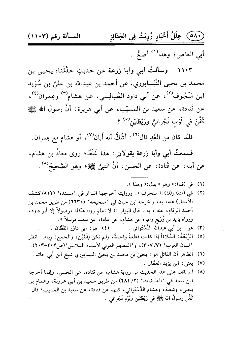 ١١٠٣ - وسألتُ أَبِي وَأَبَا زُرْعَةَ عَنْ حديثٍ حدَّثَناه يَحْيَى بْن مُحَمَّد بْن يَحْيَى النَّيْسابوري، عن أحمد بن عبد الله بْنِ عليِّ بْنِ سُوَيد بْنِ مَنْجُوف (٢) ، عَنْ أَبِي دَاوُدَ الطَّيالِسي، عَنْ هِشَامٍ (٣) وعِمران (٤) ، عَنْ قَتادة، عَنْ سَعِيدِ بْنِ الْمُسَيَّبِ، عَنْ أَبِي هُرَيْرَةَ: أنَّ رسولَ اللَّهِ (ص) كُفِّنَ فِي ثَوْبٍ نَجْرانيٍّ ورَيْطَتَيْنِ (٥) ؟