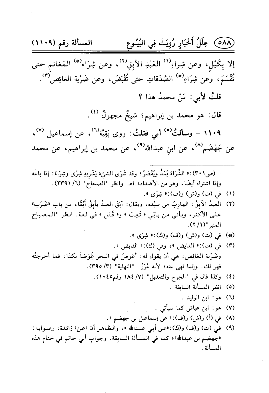 ١١٠٩ - وسألتُ (٥) أَبِي فقلتُ: رَوَى بَقِيَّة (٦) ، عَنْ إِسْمَاعِيلَ (٧) ، عَنْ جَهْضَم (٨) ، عن ابنِ عبد الله (٩) ، عَنْ مُحَمَّدِ بْنِ إِبْرَاهِيمَ، عَنْ محمد