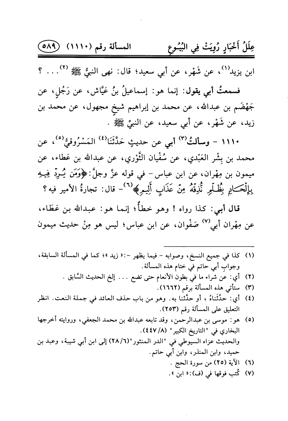١١١٠ - وسألتُ (٣) أَبِي عَنْ حديثٍ حَدَّثَنَا (٤) المَسْرُوقيُّ (٥) ، عَنْ مُحَمَّدِ بْنِ بِشْر العَبْدي، عَنْ سُفْيان الثَّوْري، عَنْ عبد الله بن عَطاء، عن ميمون