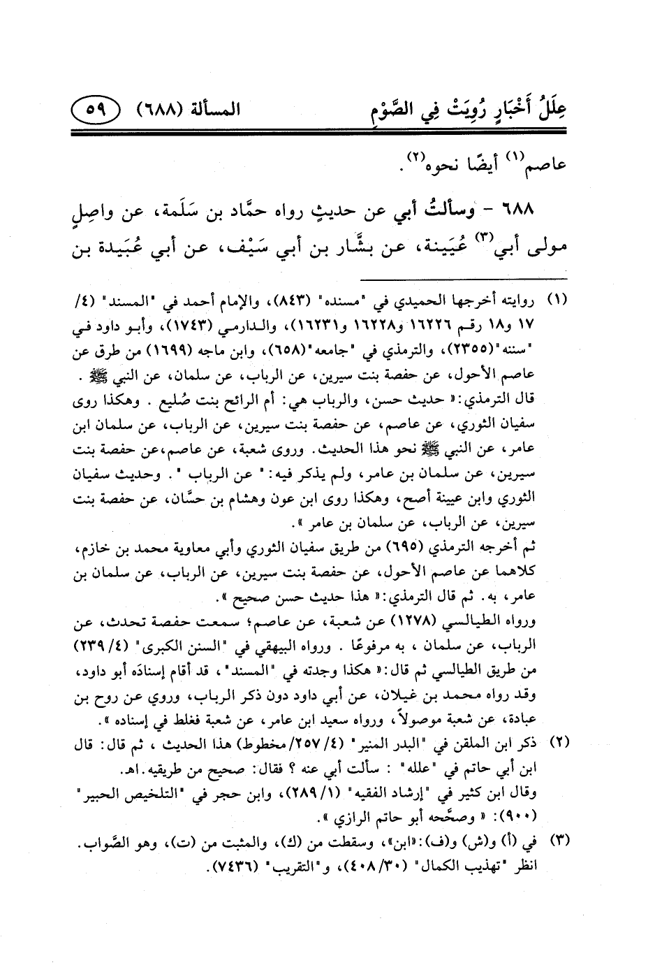 (١) روايته أخرجها الحميدي في "مسنده" (٨٤٣) ، والإمام أحمد في "المسند" (٤/١٧ و١٨ رقم ١٦٢٢٦ و١٦٢٢٨ و١٦٢٣١) ، والدارمي (١٧٤٣) ، وأبو داود في "سننه" (٢٣٥٥) ، والترمذي في "جامعه" (٦٥٨) ، وابن ماجه (١٦٩٩) من طرق عن عاصم الأحول، عَنْ حَفْصَةَ بِنْتِ سِيرِينَ، عَنْ الرَّبَابِ، عَنْ سَلْمَانَ، عَنِ النَّبِيِّ (ص) .