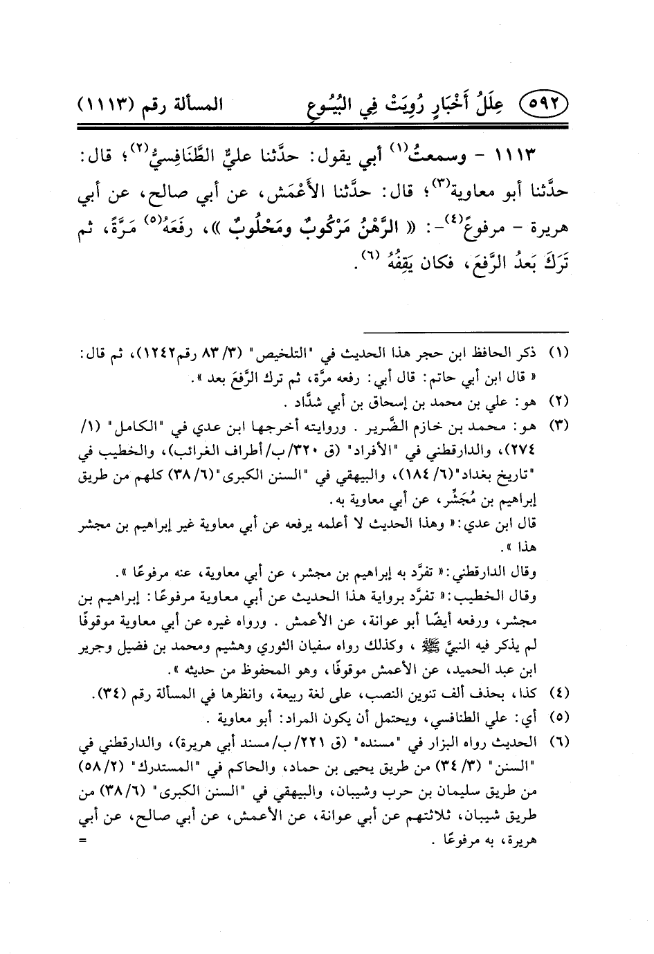 (٦) الحديث رواه البزار في "مسنده" (ق ٢٢١/ب/مسند أبي هريرة) ، والدارقطني في "السنن" (٣/٣٤) من طريق يحيى بن حماد، والحاكم في "المستدرك" (٢/٥٨) من طريق سليمان بن حرب وشيبان، والبيهقي في "السنن الكبرى" (٦/٣٨) من طريق شيبان، ثلاثتهم عَنْ أَبِي عَوَانَةَ، عَنِ الأَعْمَشِ، عَنْ أَبِي صَالِحٍ، عَنْ أَبِي هريرة، به مرفوعًا.