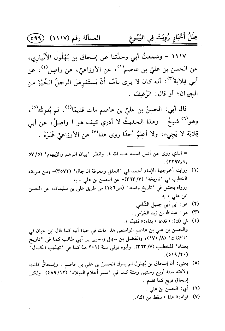 ١١١٧ - وسمعتُ أَبِي وحدَّثنا عَنْ إِسْحَاقَ ابن بُهْلُول الأَنْبارِي، عَنِ الْحَسَنِ بْنِ عليِّ بْنِ عَاصِمٍ (١) ، عَنِ الأوزاعيِّ، عَنْ واصِل (٢) ، عَنْ أَبِي قِلابَة (٣) : أَنَّهُ كَانَ لا يَرَى بَأْسًا أَنْ يَستَقرِضَ الرجلُ الخُبْزَ مِنَ الجِيران؛ أَوْ قَالَ: الرَّغِيفَ.