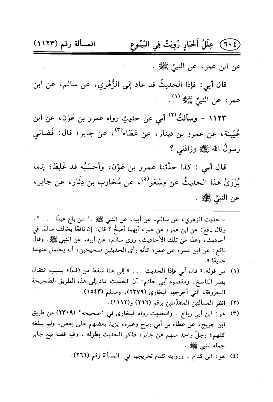 ١١٢٣ - وسألتُ (٢) أَبِي عَنْ حديثٍ رَوَاهُ عَمْرُو بْنُ عَوْن، عَنِ ابْنِ عُيَينة، عَنْ عَمْرِو بْنِ دِينَارٍ، عَنْ عَطَاء (٣) ، عَنْ جَابِرٍ؛ قَالَ: قَضاني رسولُ الله (ص) وزادَني؟