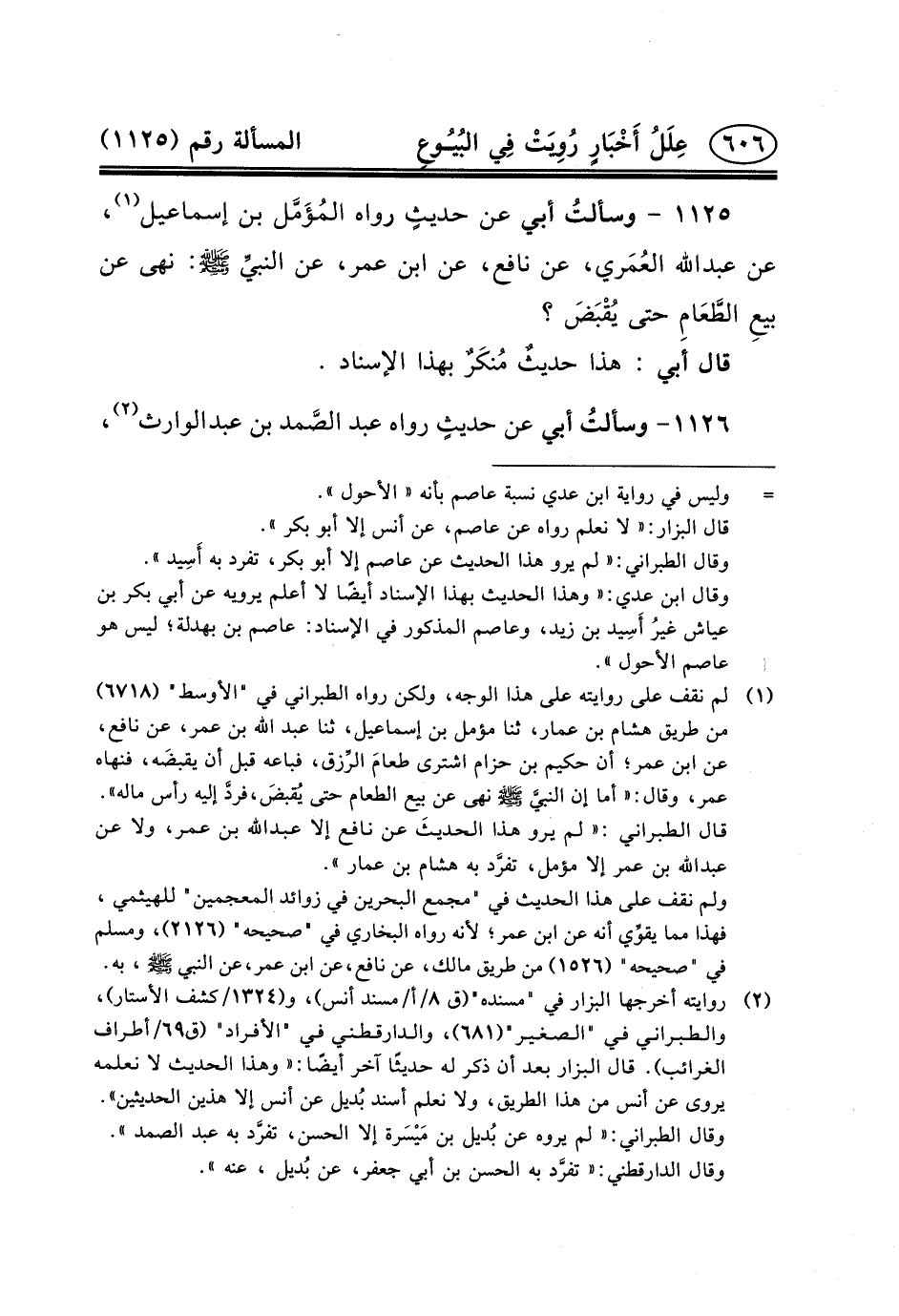 ١١٢٥ - وسألتُ أَبِي عَنْ حديثٍ رَوَاهُ المُؤَمَّل بن إسماعيل (١) ، عن عبد الله العُمَري، عَنْ نَافِعٍ، عَنِ ابْنِ عمر، عن النبيِّ (ص) : نَهَى عَنْ بيعِ الطَّعَامِ حَتَّى يُقْبَضَ؟