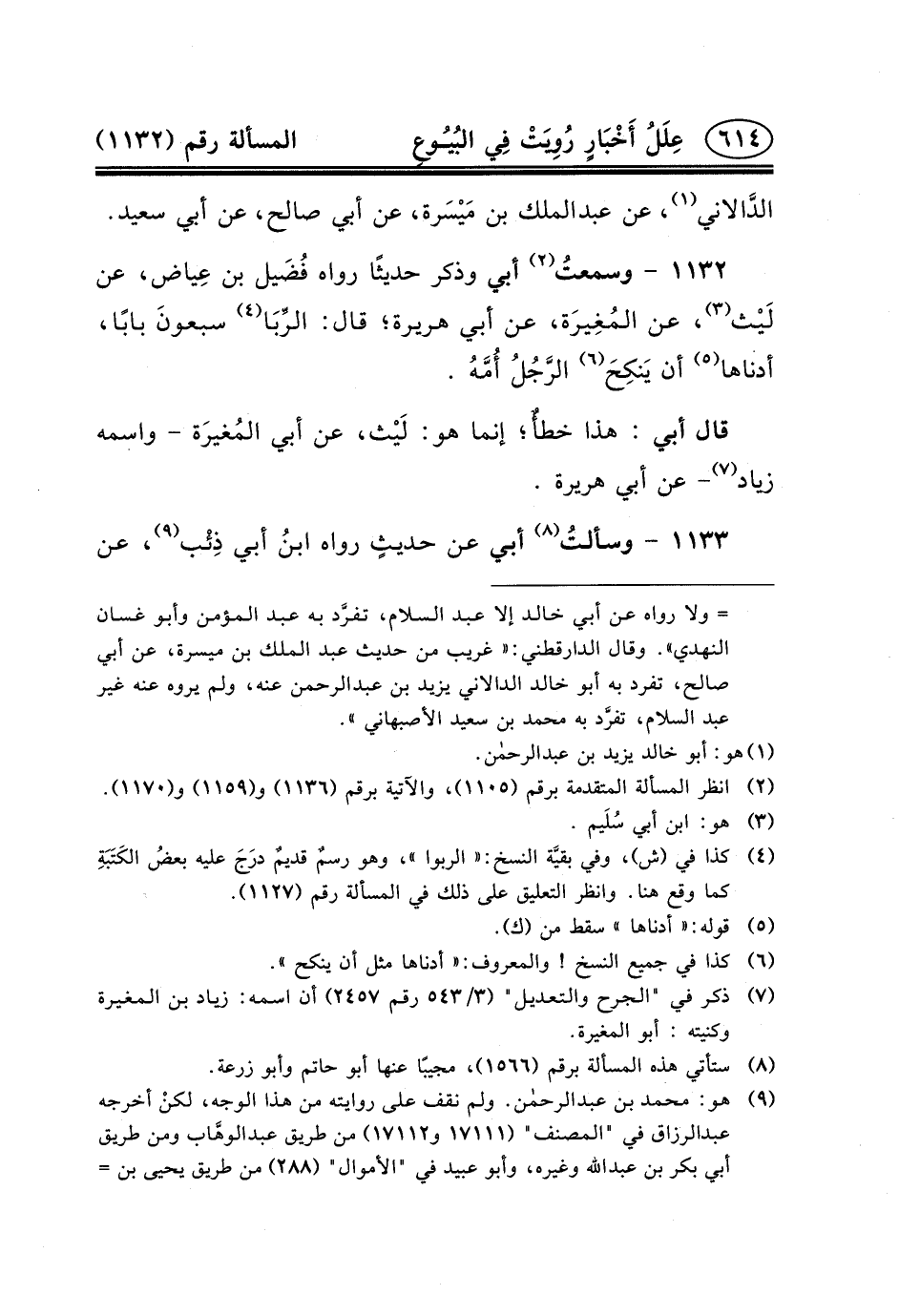 ١١٣٢ - وسمعتُ (٢) أَبِي وذكر حَدِيثًا رَوَاهُ فُضَيل بْنُ عِياض، عَنْ لَيْث (٣) ، عَنِ المُغِيرَة، عَنْ أَبِي هُرَيْرَةَ؛ قَالَ: الرِّبَا (٤) سبعونَ بابًا، أدناها (٥) أَنْ يَنكِحَ (٦) الرَّجُلُ أُمَّهُ.