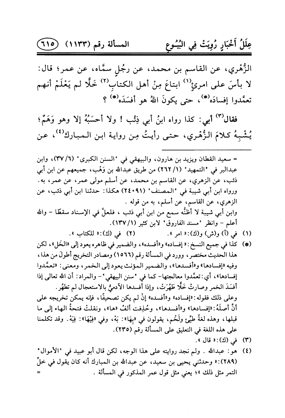 (٤) هو: عبد الله. ولم نجد روايته على هذا الوجه، لكن قال أبو عبيد في "الأموال" (٢٨٩) : «وحدثني يحيى ابن سعيد، عن عبد الله بن المبارك أنه كان يقول في خلِّ التمر مثل ذلك» ؛ يعني مثل قول عمر المذكور في المسألة.