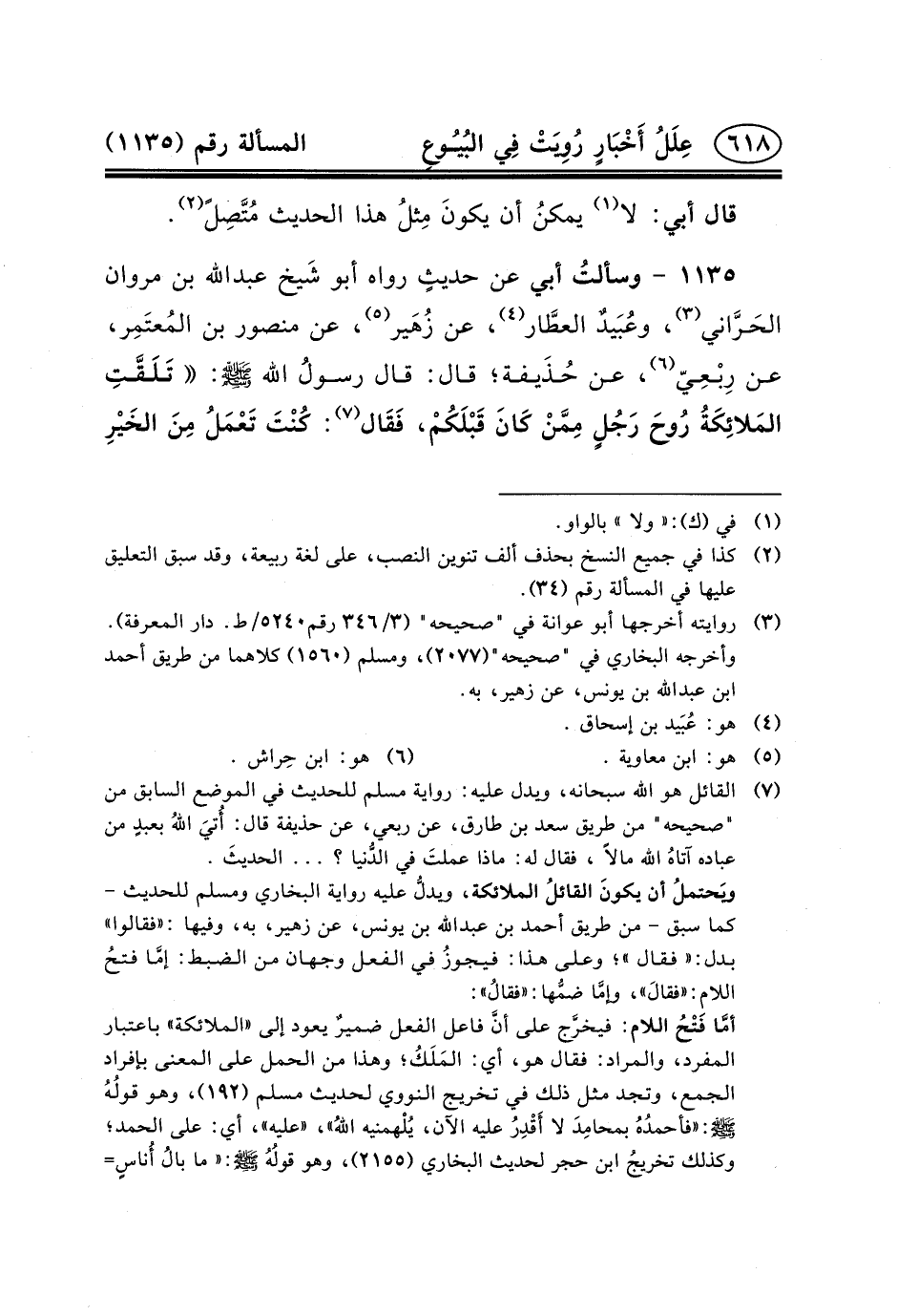 ١١٣٥ - وسألتُ أَبِي عَنْ حديثٍ رواه أبو شَيخ عبد الله بْنُ مَرْوَانَ الحَرَّاني (٣) ، وعُبَيدٌ العطَّار (٤) ، عَنْ زُهَير (٥) ، عَنْ مَنْصُورِ بْنِ المُعتَمِر، عَنْ رِبْعِيّ (٦) ، عَنْ حُذَيفة؛ قال: قال رسولُ الله (ص) : تَلَقَّتِ المَلائِكَةُ رُوحَ رَجُلٍ مِمَّنْ كَانَ قَبْلَكُمْ، فَقَال (٧) :