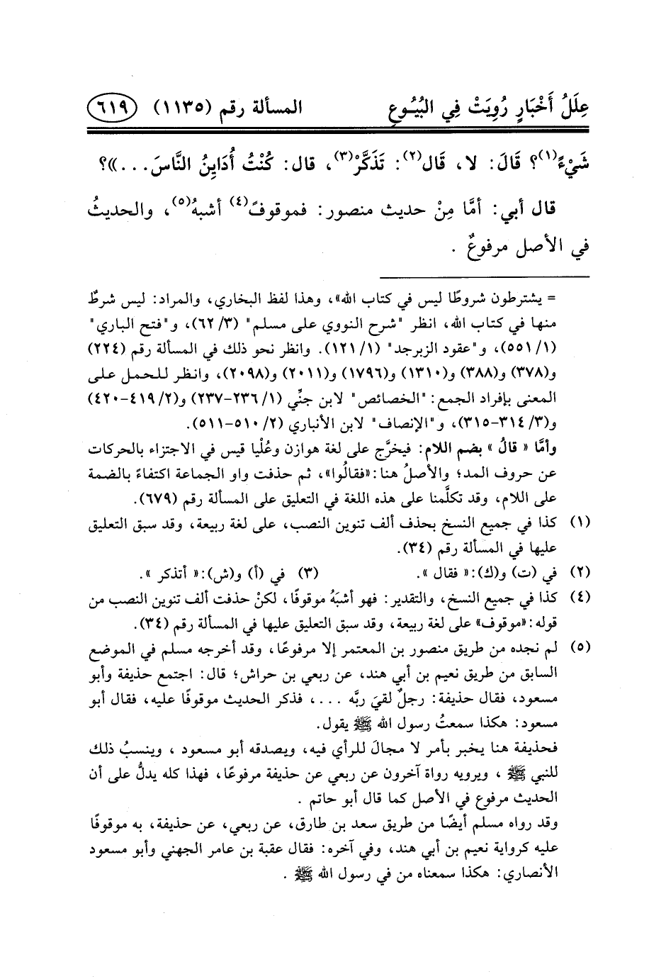 (٤) كذا في جميع النسخ، والتقدير: فهو أشبَهُ موقوفًا، لكنْ حذفت ألف تنوين النصب من قوله: «موقوف» على لغة ربيعة، وقد سبق التعليق عليها في المسألة رقم (٣٤) .