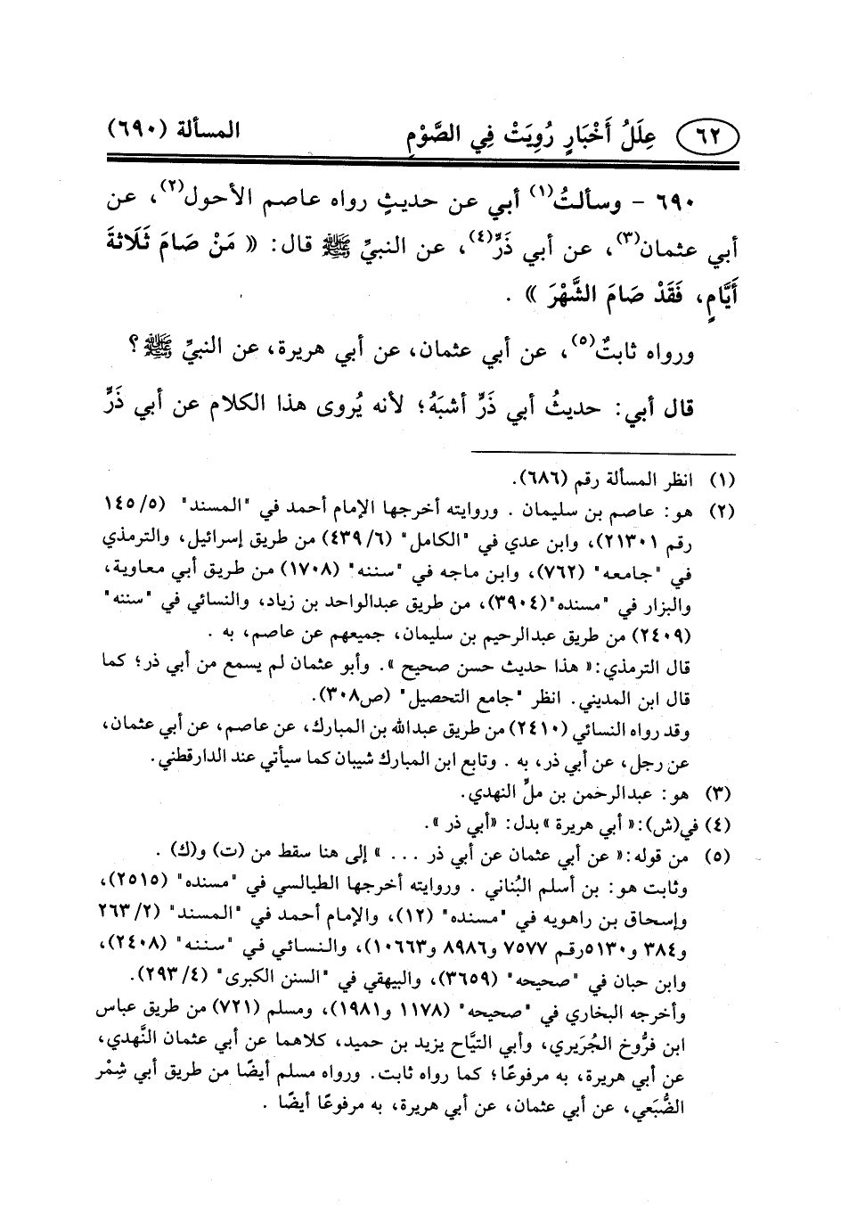٦٩٠ - وسألتُ (٢) أَبِي عَنْ حديثٍ رَوَاهُ عَاصِمٍ الأَحْوَلِ (٣) ، عَنْ أَبِي عُثْمَانَ (٤) ، عَنْ أَبِي ذَرٍّ (٥) ، عَنِ النبيِّ (ص) قَالَ: مَنْ صَامَ ثَلَاثةَ أَيَّامٍ، فَقَدْ صَامَ الشَّهْرَ.