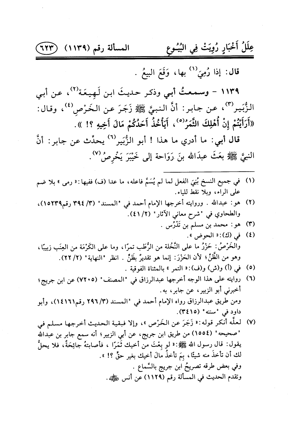 قَالَ أَبِي: مَا أَدْرِي مَا هَذَا! أَبُو الزُّبَير (٦) يحدِّث عَنْ جَابِرٍ: أنَّ النبيَّ (ص) بعَثَ عبدَالله ابنَ رَوَاحة إلى خَيْبَرَ يَخْرِصُ (٧) .