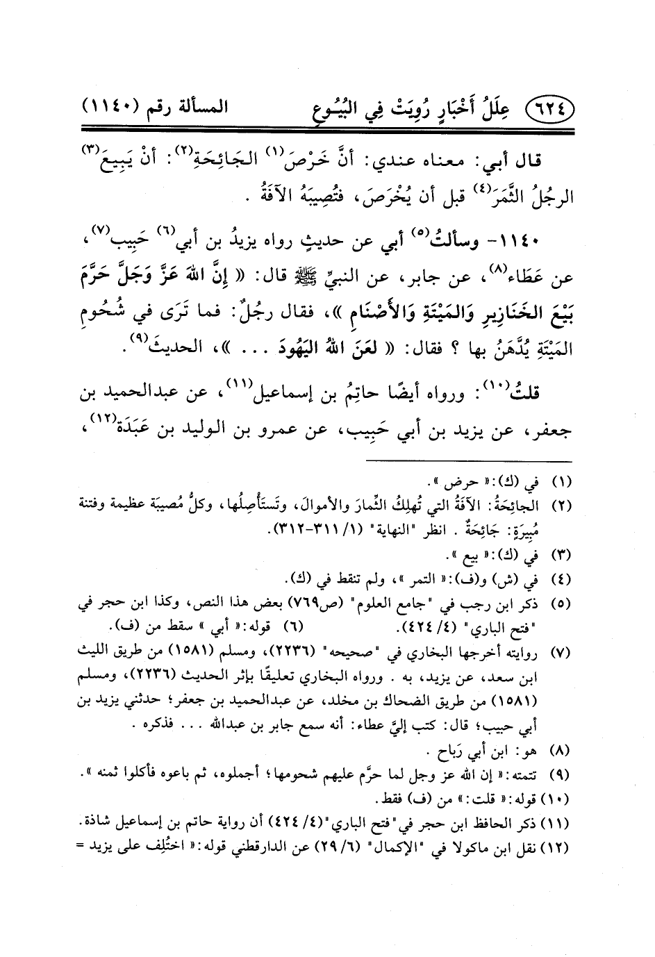 ١١٤٠- وسألتُ (٥) أَبِي عَنْ حديثٍ رَوَاهُ يزيدُ بْنُ أَبِي (٦) حَبِيب (٧) ، عَنْ عَطَاء (٨) ، عَنْ جَابِرٍ، عَنْ النبيِّ (ص) قَالَ: إِنَّ اللهَ عَزَّ وَجَلَّ حَرَّمَ بَيْعَ الخَنَازِيرِ وَالمَيْتَةِ وَالأَصْنَامِ، فَقَالَ رجُلٌ: فَمَا تَرَى فِي شُحُومِ المَيْتَةِ يُدَّهَنُ بِهَا؟ فَقَالَ: لعَنَ اللهُ اليَهُودَ ... ، الحديثَ (٩) .