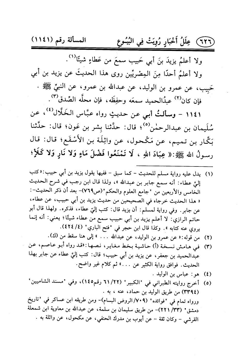 (١) يدل عليه رواية مسلم للحديث - كما سبق - ففيها يقول يزيد بن أبي حبيب: «كتب إليَّ عطاء: أنه سمع جابر بن عبد الله» ، ولذا قال ابن رجب في شرح الحديث الخامس والأربعين من "جامع العلوم والحكم" (ص٧٦٩) - بعد أن ذكر الحديث-: «هذا الحديث خرجاه في الصحيحين من حَدِيث يزيد بْن أَبِي حَبِيبٍ، عَنْ عَطَاءٍ، عَنْ جَابِرٍ. وفي رواية لمسلم: أن يزيد قال: كتب إليّ عطاء، فذكره. ولهذا قال أبو حاتم الرازي: لا أَعْلَمُ يَزِيدَ بْنَ أَبِي حَبِيبٍ سمع من عطاء شيئًا؛ يعني: أنه إنما يروي عنه كتابه» . وكذا قال ابن حجر في "فتح الباري" (٤/٤٢٤) .