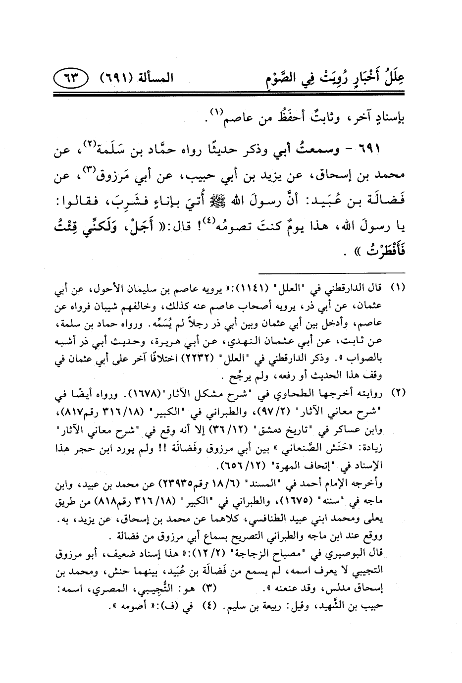 عَنِ مُحَمَّدُ بْنُ إِسْحَاقَ، عَنْ يَزِيدَ بْنِ أَبِي حَبِيبٍ، عَنْ أَبِي مَرزوق (٣) ، عَنْ فَضالَة بْنِ عُبَيد: أنَّ رسولَ الله (ص) أُتيَ بإناءٍ فشَرِبَ، فَقَالُوا: يَا رسولَ اللَّهِ، هَذَا يومٌ كنتَ تصومُه (٤) ! قَالَ: أَجَلْ، وَلَكنِّي قِئْتُ فَأَفْطَرْتُ.