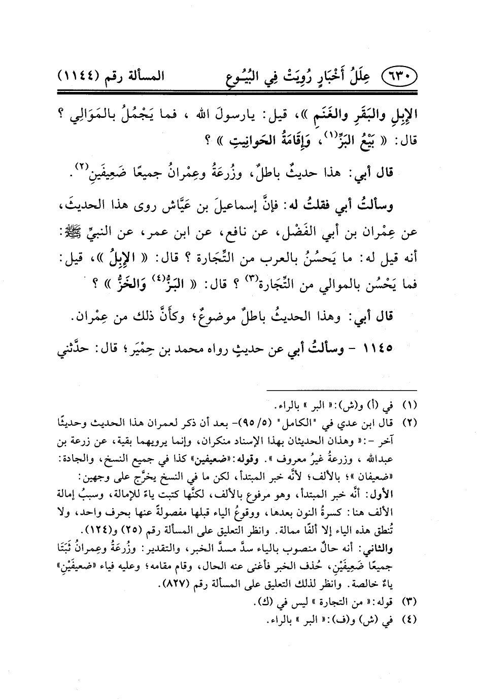 وسألتُ أَبِي فقلتُ لَهُ: فإنَّ إسماعيلَ بْنَ عَيَّاش رَوَى هَذَا الحديثَ، عَنْ عِمْران بْنِ أَبِي الفَضْل، عَنْ نَافِعٍ، عَنِ ابْنِ عُمَرَ، عَنْ النبيِّ (ص) : أَنَّهُ قِيلَ لَهُ: مَا يَحسُنُ بِالْعَرَبِ مِنَ التِّجَارة؟ قَالَ: الإِبِلُ، قِيلَ: فَمَا يَحْسُن بِالْمَوَالِي مِنَ التِّجَارة (٣) ؟ قَالَ: البَزُّ (٤) وَالخَزُّ؟