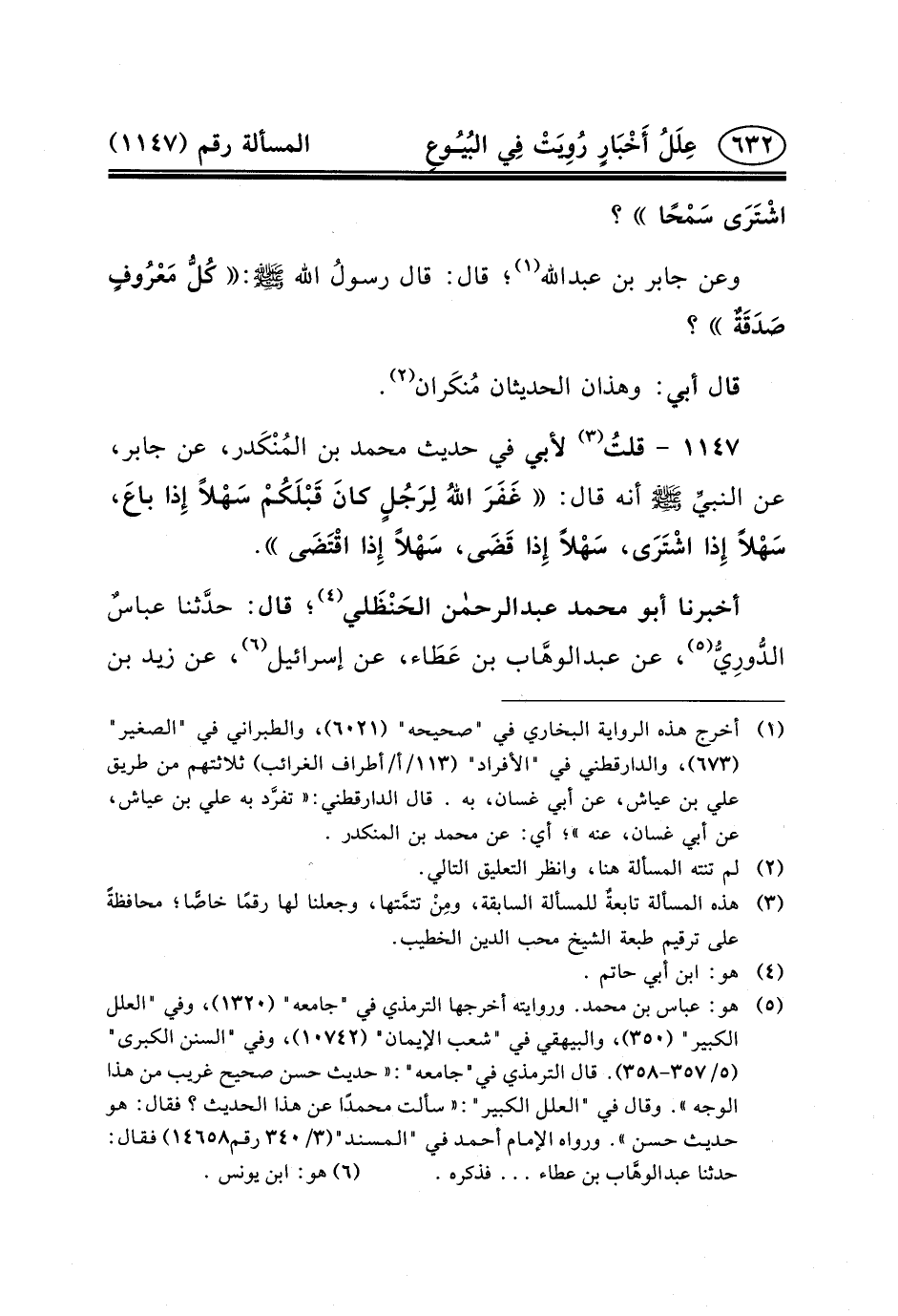 ١١٤٧ - قلتُ (٣) لأَبِي في حديث محمد ابْنِ المُنْكَدر، عَنْ جَابِرٍ، عَنِ النبيِّ (ص) أَنَّهُ قَالَ: غَفَرَ اللهُ لِرَجُلٍ كانَ قَبْلَكُمْ سَهْلاً إِذا باعَ، سَهْلاً إِذا اشْتَرَى، سَهْلاً إِذا قَضَى، سَهْلاً إِذا اقْتَضَى.