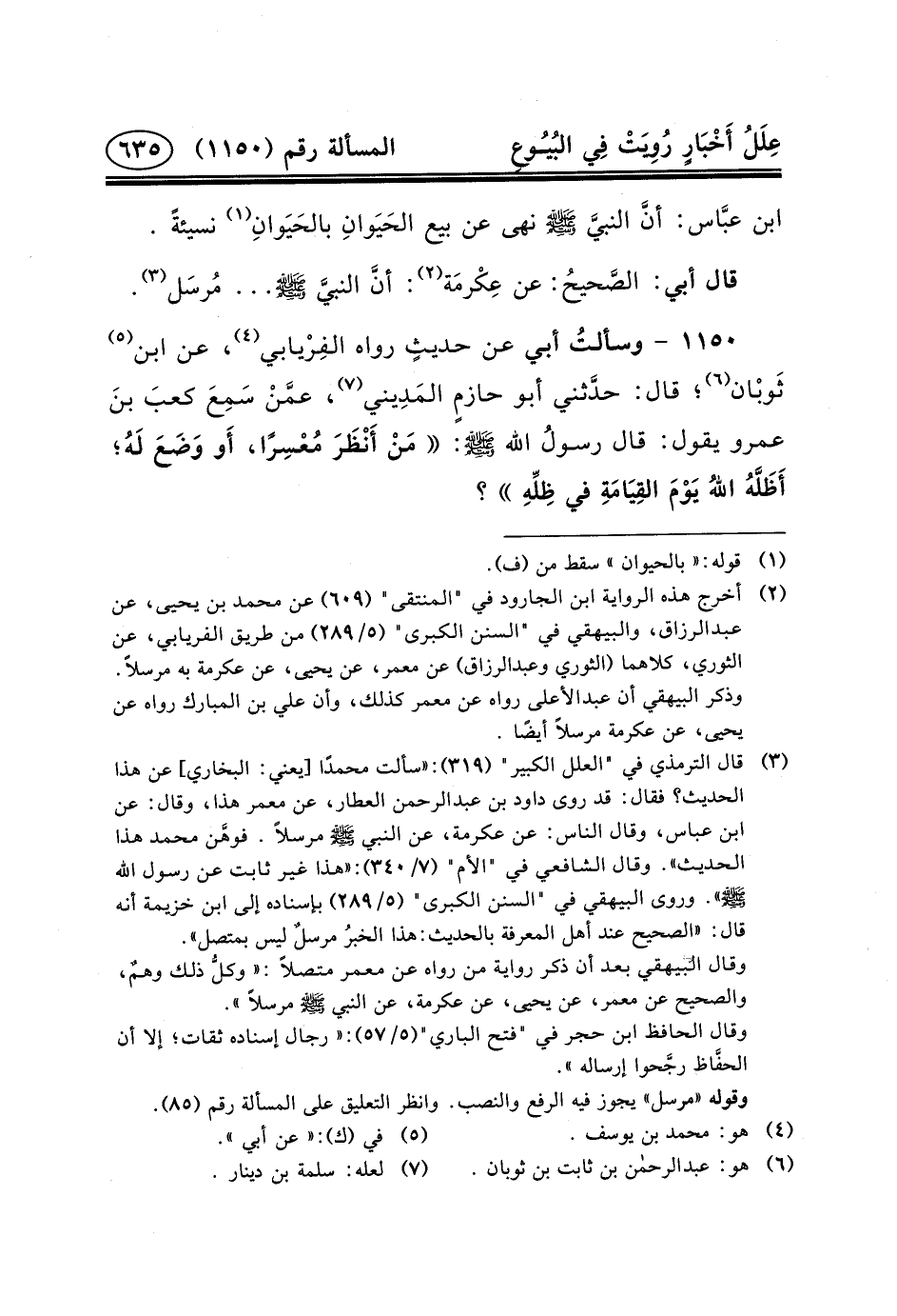 ١١٥٠ - وسألتُ أَبِي عَنْ حديثٍ رَوَاهُ الفِرْيابي (٤) ، عَنِ ابْنِ (٥) ثَوبْان (٦) ؛ قَالَ: حدَّثني أَبُو حازمٍ المَدِيني (٧) ، عمَّنْ سَمِعَ كعبَ بنَ عَمْرٍو يقول: قال رسولُ الله (ص) : مَنْ أَنْظَرَ مُعْسِرًا، أَو وَضَعَ لَهُ؛ أَظَلَّهُ اللهُ يَوْمَ القِيَامَةِ في ظِلِّهِ؟