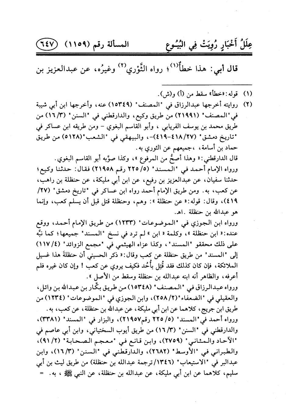 قال البزار: «وهذا الحديث لا نعلمه يروى عن النبي (ص) إلا عَنْ عَبْدِ اللَّهِ بْنِ حَنْظَلَةَ، وقد رواه بعضهم عَنِ ابْنِ أَبِي مُلَيْكَةَ، عَنِ رجل، عن عبد الله بن حنظلة» .