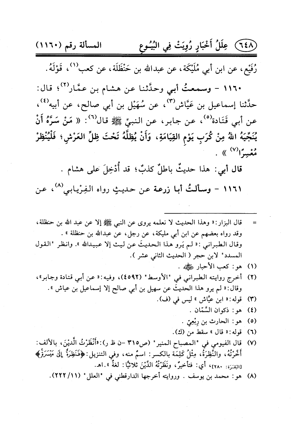 ١١٦٠ - وسمعتُ أَبِي وحدَّثنا عَنْ هِشَامِ ابن عمَّار (٢) ؛ قَالَ: حدَّثنا إِسْمَاعِيلُ بْنُ عَيَّاش (٣) ، عَنْ سُهَيْل بْنِ أَبِي صَالِحٍ، عَنْ أَبِيهِ (٤) ، عَنْ أَبِي قَتَادة (٥) ، عَنْ جَابِرٍ، عَنِ النبيِّ (ص) قَالَ (٦) : مَنْ سَرَّهُ أَنْ يُنَجِّيَهُ اللهُ مِنْ كُرَبِ يَوْمِ القِيَامَةِ، وَأَنْ يُظِلَّهُ تَحْتَ ظِلِّ العَرْشِ؛ فَلْيُنْظِرْ مُعْسِرًا (٧) .