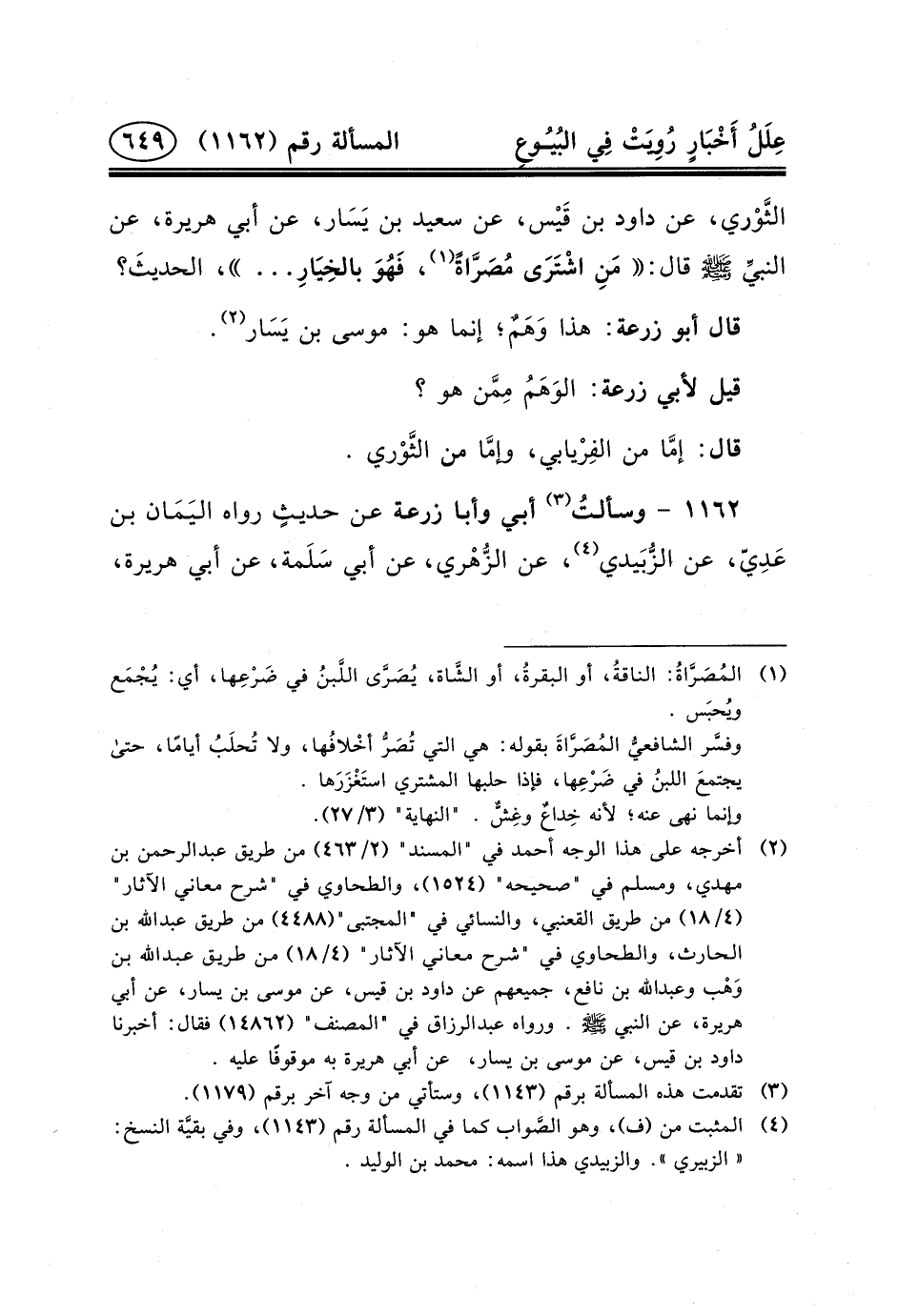 الثَّوْري، عَنْ دَاوُدَ بْنِ قَيْس، عَنْ سَعِيدِ بْنِ يَسَار، عَنْ أبي هريرة، عن النبيِّ (ص) قَالَ: مَنِ اشْتَرَى مُصَرَّاةً (١) ، فَهُوَ بالخِيَارِ ... ، الحديثَ؟