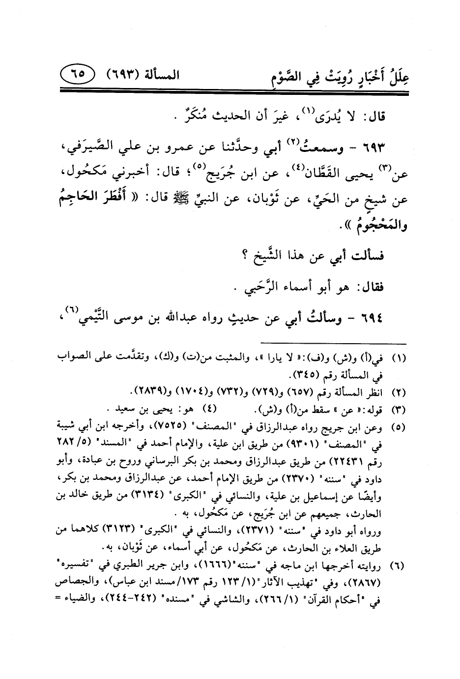 ٦٩٣ - وسمعتُ (٢) أَبِي وحدَّثنا عَنْ عَمْرِو بْنِ عَلِيٍّ الصَّيرَفي، عَنْ (٣) يَحْيَى القَطَّان (٤) ، عَنِ ابْنِ جُرَيج (٥) ؛