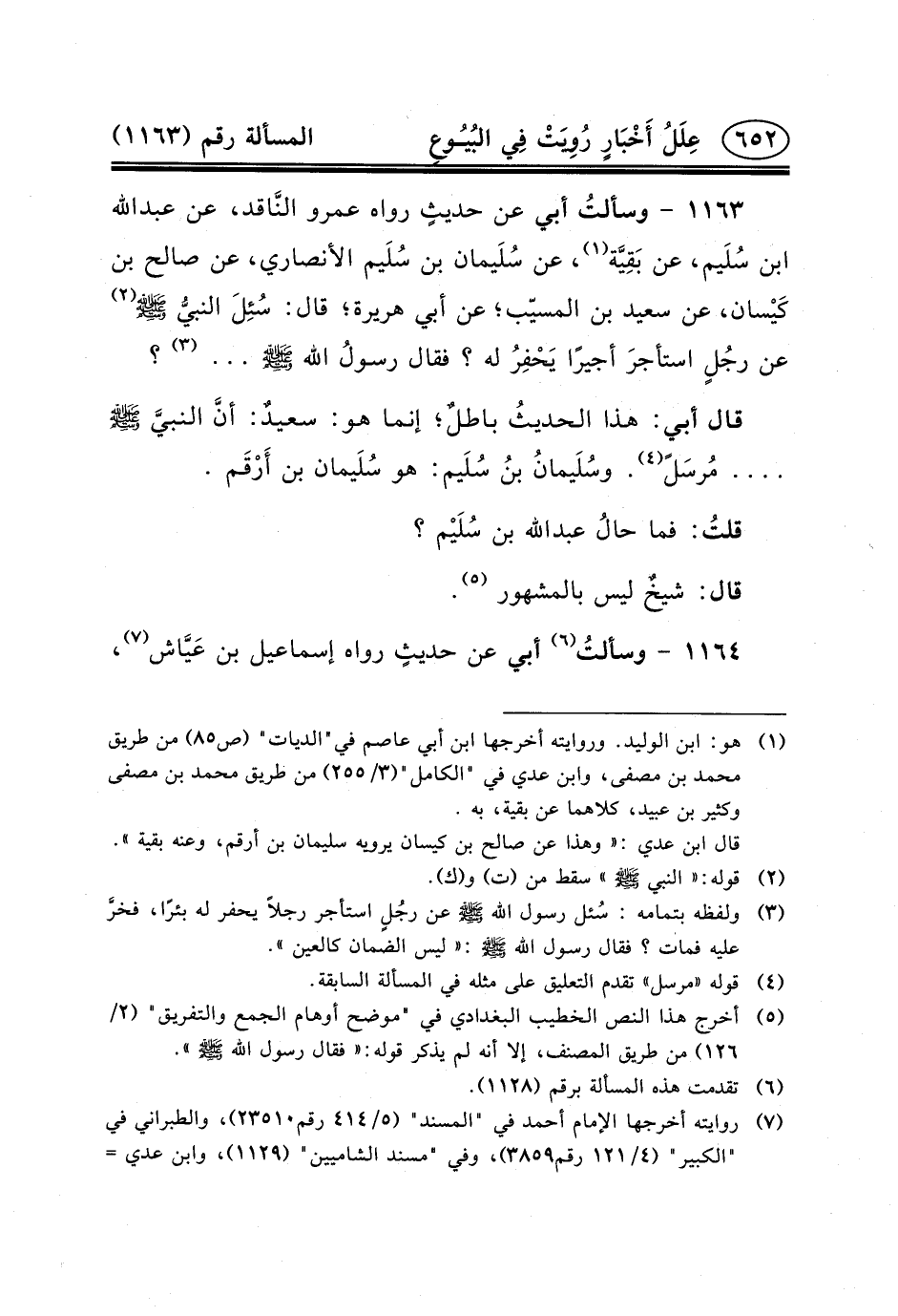 ١١٦٣- وسألتُ أَبِي عَنْ حديثٍ رَوَاهُ عمرو النَّاقد، عن عبد الله بْنِ سُلَيم، عَنْ بَقِيَّة (١) ، عَنْ سُلَيمان بْنِ سُلَيم الأَنْصَارِيِّ، عَنْ صَالِحِ بْنِ كَيْسان، عَنْ سَعِيدٍ بْنِ الْمُسَيِّبِ؛ عَنْ أَبِي هُرَيْرَةَ؛ قال: سُئِلَ النبيُّ (ص) (٢) عَنْ رجُلٍ استأجرَ أَجِيرًا يَحْفِرُ له؟ فقال رسولُ الله (ص) ... (٣) ؟