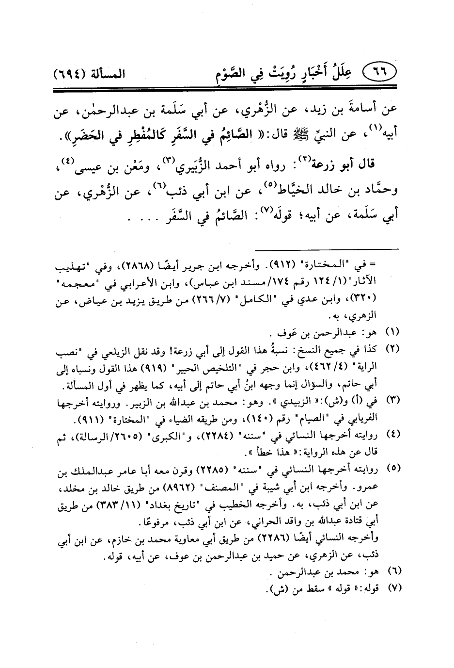 قَالَ أَبُو زُرْعَةَ (٢) : رَوَاهُ أَبُو أَحَمْدَ الزُّبَيري (٣) ، ومَعْن بْنُ عِيسَى (٤) ، وحمَّاد بْنُ خَالِدٍ الخيَّاط (٥) ، عَنِ ابْنِ أَبِي ذِئْبٍ (٦) ، عَنِ الزُّهْري، عَنْ أَبِي سَلَمة، عَنْ أَبِيهِ؛ قولَه (٧) : الصَّائمُ فِي السَّفَر ... .