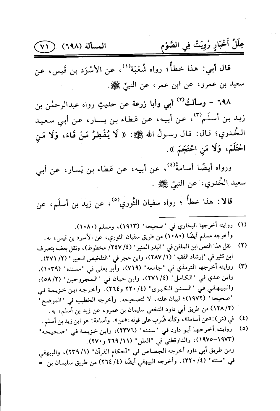 ٦٩٨- وسألتُ (٢) أَبِي وَأَبَا زُرْعَةَ عَنْ حديثٍ رواه عبد الرحمن بْنُ زَيْدِ بْنِ أسلَم (٣) ، عَنْ أَبِيهِ، عَنْ عَطاء بْنِ يَسَارٍ، عَنْ أَبِي سَعِيدٍ الخُدري؛ قَالَ: قال رسولُ الله (ص) : لَا يُفْطِرُ مَنْ قَاءَ، وَلَا مَنِ احْتَلَمَ، وَلَا مَنِ احْتَجَمَ.