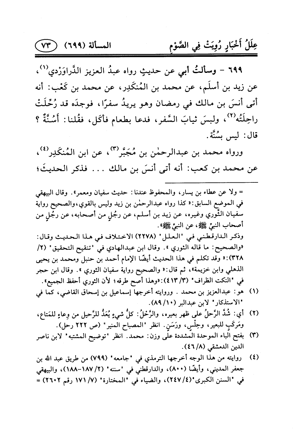 ٦٩٩ - وسألتُ أَبِي عَنْ حديثٍ رَوَاهُ عبدُالعزيز الدَّراوَرْدي (١) ، عَنْ زَيْدِ بْنِ أسلَم، عَنْ مُحَمَّدِ بْنِ المُنكَدِر، عَن مُحَمَّدِ بْنِ كَعْب: أَنَّهُ أَتَى أنسَ بْنَ مَالِكٍ فِي رَمَضَانَ وَهُوَ يريدُ سَفَرًا، فوجدَه قَدْ رُحِّلَتْ راحِلَتُه (٢) ، ولبسَ ثيابَ السَّفر، فَدَعَا بِطَعَامٍ فأكَل، فقُلنا: أَسُنَّةٌ؟ قَالَ: لَيْسَ بسُنَّة.
