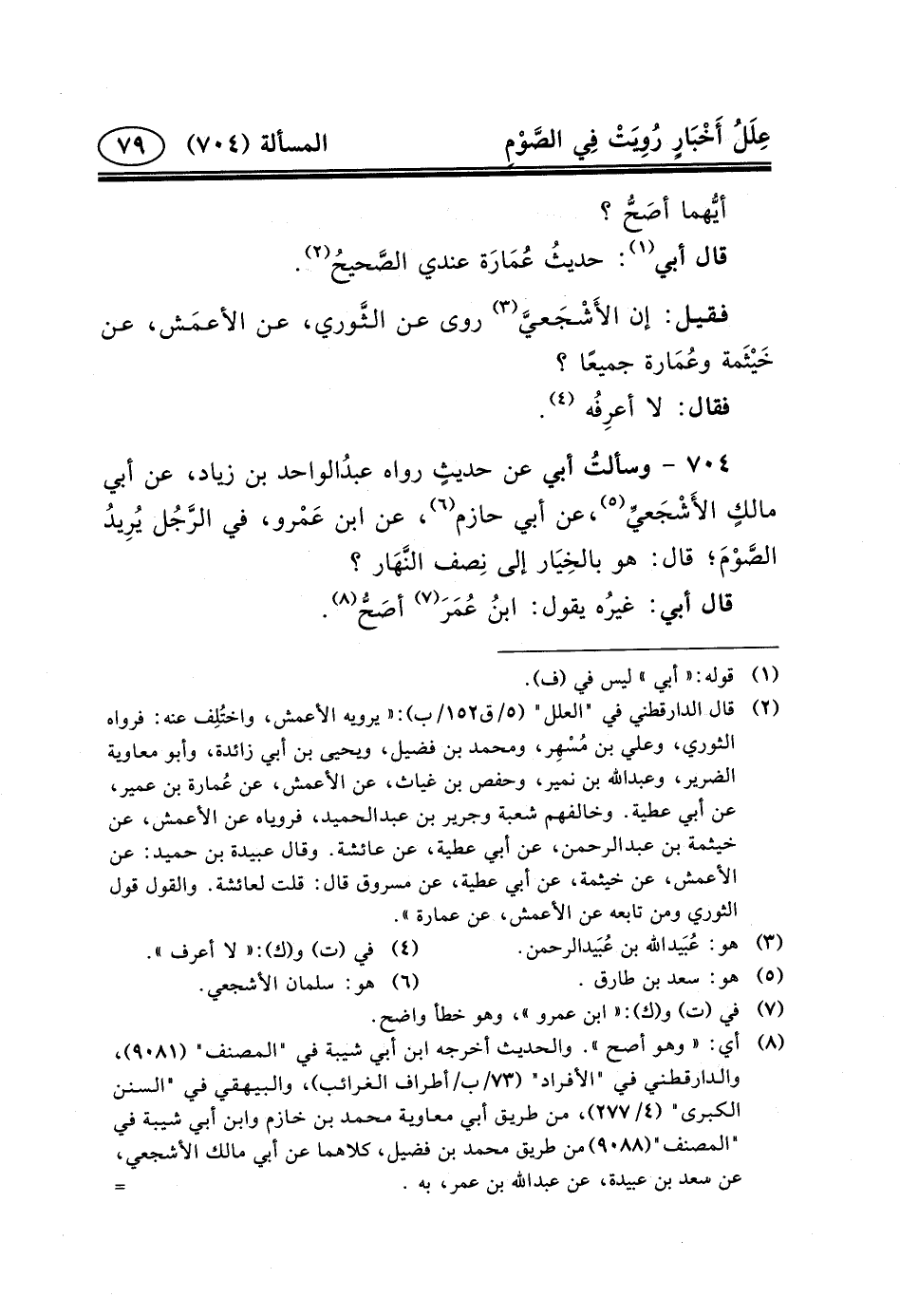 ٧٠٤ - وسألتُ أَبِي عن حديثٍ رواه عبدُالواحد بْنُ زِيَادٍ، عَنْ أَبِي مالكٍ الأَشْجَعيِّ (٥) ، عَنْ أَبِي حَازِمٍ (٦) ، عَنِ ابْنِ عَمْرو، فِي الرَّجُل يُرِيدُ الصَّوْمَ؛ قَالَ: هُوَ بالخِيَار إِلَى نِصف النَّهَار؟