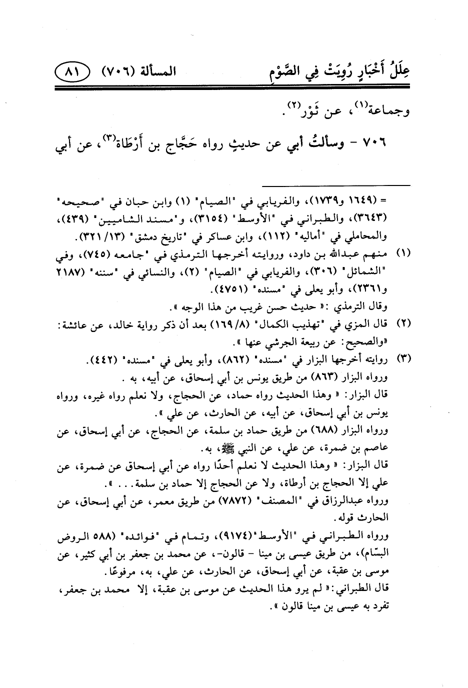 ٧٠٦ - وسألتُ أَبِي عَنْ حديثٍ رَوَاهُ حَجَّاج بْنُ أَرْطَاة (٣) ،