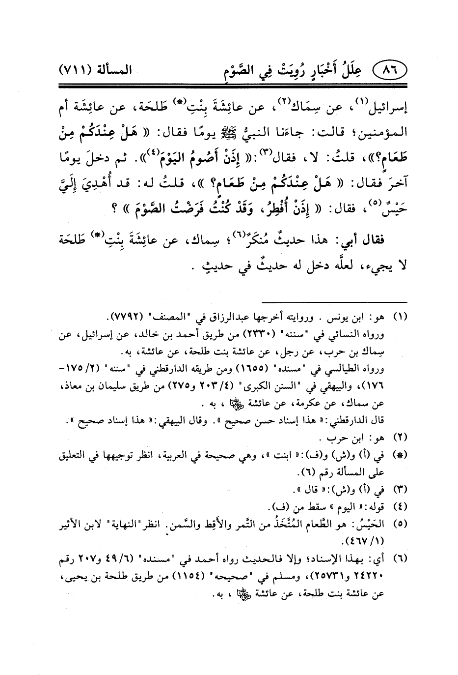 عَنْ عائِشَةَ بِنْتِ (*) طَلحَة، عَنْ عائِشَة أُمِّ المؤمنين؛ قالت: جاءَنا النبيُّ (ص) يَوْمًا فَقَالَ: هَلْ عِنْدَكُمْ مِنْ طَعَامٍ؟ ، قلتُ: لا، فقال (٣) : إِذَنْ أَصُومُ اليَوْمَ (٤) . ثُمَّ دخلَ يَوْمًا آخرَ فَقَالَ: هَلْ عِنْدَكُمْ مِنْ طَعَامٍ؟ ، قلتُ لَهُ: قَدْ أُهْدِيَ إِلَيَّ حَيْسٌ (٥) ، فقال: إِذَنْ أُفْطِرُ، وَقَدْ كُنْتُ فَرَضْتُ الصَّوْمَ؟