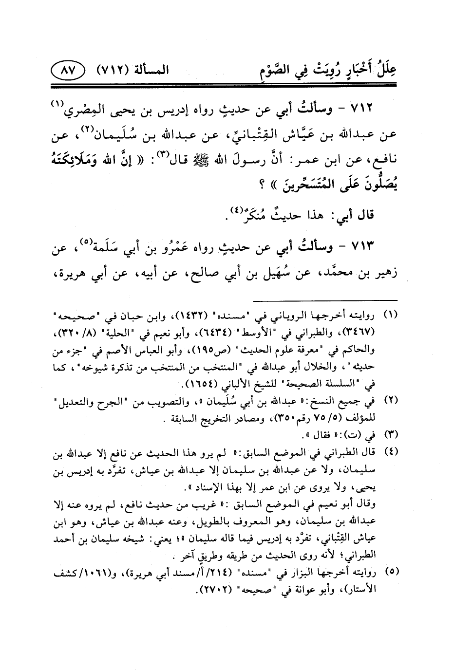 ٧١٢ - وسألتُ أَبِي عَنْ حديثٍ رَوَاهُ إِدْرِيسُ بْنُ يَحْيَى المِصْري (١) عَنْ عبد الله بن عَيَّاش القِتْبانيِّ، عن عبد الله بْنِ سُلَيمان (٢) ، عَنْ نَافِعٍ، عَنِ ابن عمر: أنَّ رسولََ الله (ص) قَالَ (٣) : إنَّ اللَّهَ وَمَلَائِكَتَهُ يُصَلُّونَ عَلَى المُتَسَحِّرينَ؟
