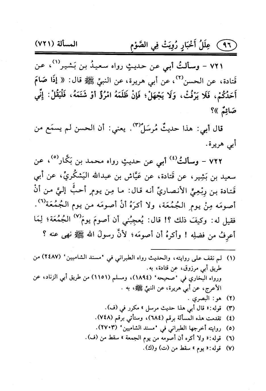 ٧٢٢ - وسألتُ (٤) أَبِي عَنْ حديثٍ رَوَاهُ مُحَمَّدُ بْنُ بَكَّار (٥) ، عَنْ سَعِيدِ بْنِ بَشِير، عَنْ قَتادة، عَنْ عَيَّاش بن عبد الله اليَشكُريِّ، عَنْ أَبِي قَتادة بْنِ رِبْعِيٍّ الأنصاريِّ أَنَّهُ قَالَ: مَا مِن يوم ٍ أحبُّ َ إليَّ مِنْ أنْ أصومَه مِنْ يوم ِ الجُمُعَة، وَلا أكرَهُ أنْ أصومَه مِنْ يَوْمِ الجُمُعَة (٦) . فَقِيلَ لَهُ: وكيفَ ذَلِكَ؟! قَالَ: يُعجِبُني أَنْ أصومَ يومَ (٧) الجُمُعَة؛ لِمَا أعرِفُ مِنْ فضلِه! وأكرهُ أَنْ أصومَه؛ لأنَّ رسولََ الله (ص) نهى عنه؟