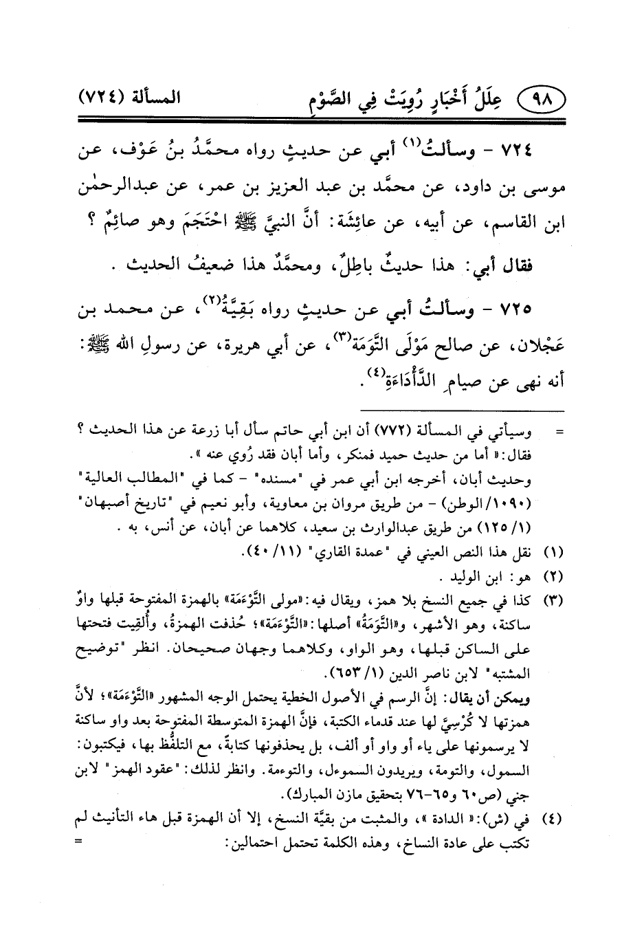 ٧٢٥ - وسألتُ أَبِي عَنْ حديثٍ رَوَاهُ بَقِيَّةُ (٢) ، عَنْ مُحَمَّدِ بْنِ عَجْلان، عَنْ صَالِحٍ مَوْلَى التَّوَمَة (٣) ، عَنْ أَبِي هُرَيْرَةَ، عَنْ رسولِ الله (ص) : أنه نهى عن صيام ِ الدَّأْدَاءَةِ (٤) .