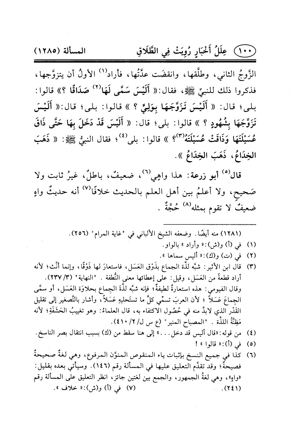 (٦) كذا في جميع النسخ بإثبات ياء المنقوص المنوَّن المرفوع، وهي لغةٌ صحيحةٌ فصيحةٌ؛ وقد تقدَّم التعليق عليها في المسألة رقم (١٤٦) . وسيأتي بعده بقليل: «واهٍ» ، وهي لغةُ الجمهور، والجمع بين لغتين جائز، انظر التعليق على المسألة رقم (٢٤١) .